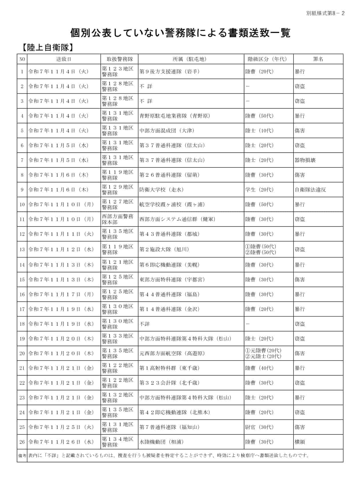 - 陸上自衛隊、令和7年11月における逮捕・送致の実績を公開(1月16日)