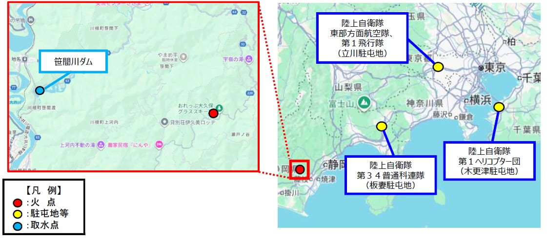 ・本日06時50分以降、陸上自衛隊第1ヘリコプター団(木更津・千葉県)、陸上自衛隊第1飛行隊(立川・東京都)、陸上自衛隊東部方面航空隊(立川・東京都)が、空中消火活動等を実施。