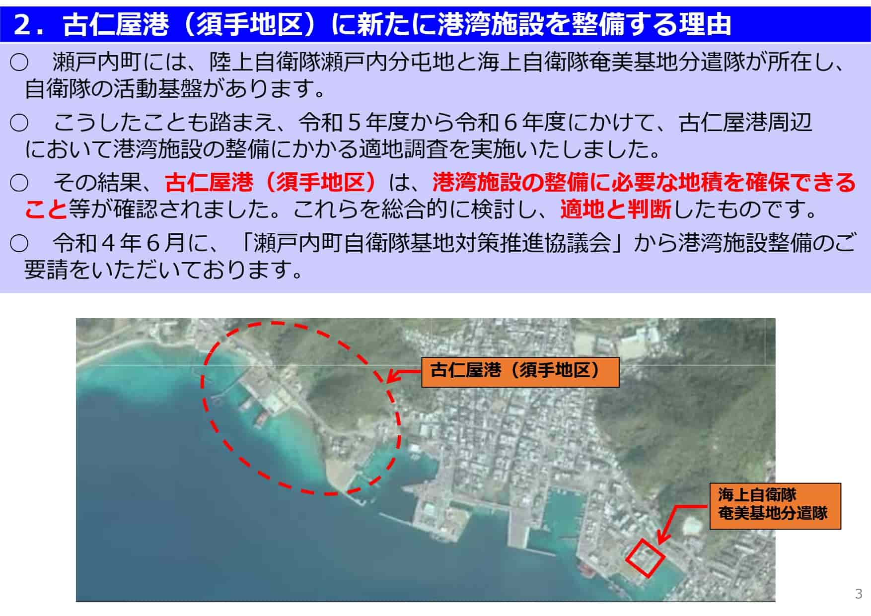 防衛省 九州防衛局は令和8(2026)年1月18日(日)、古仁屋港(須手地区)における輸送・補給拠点の整備について以下のように公表した。