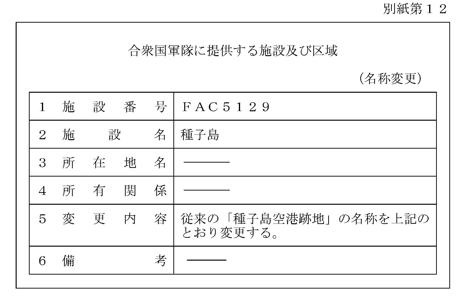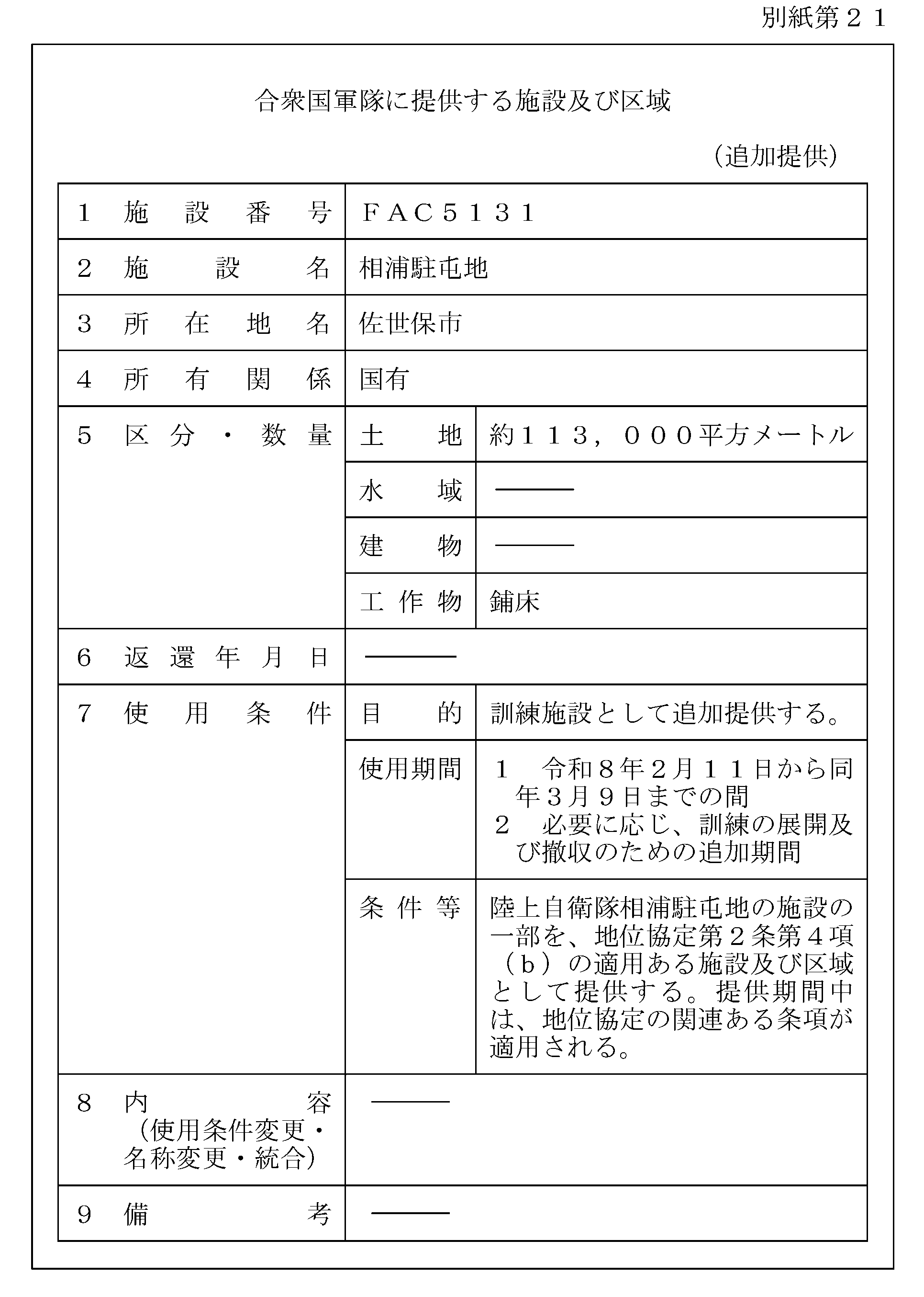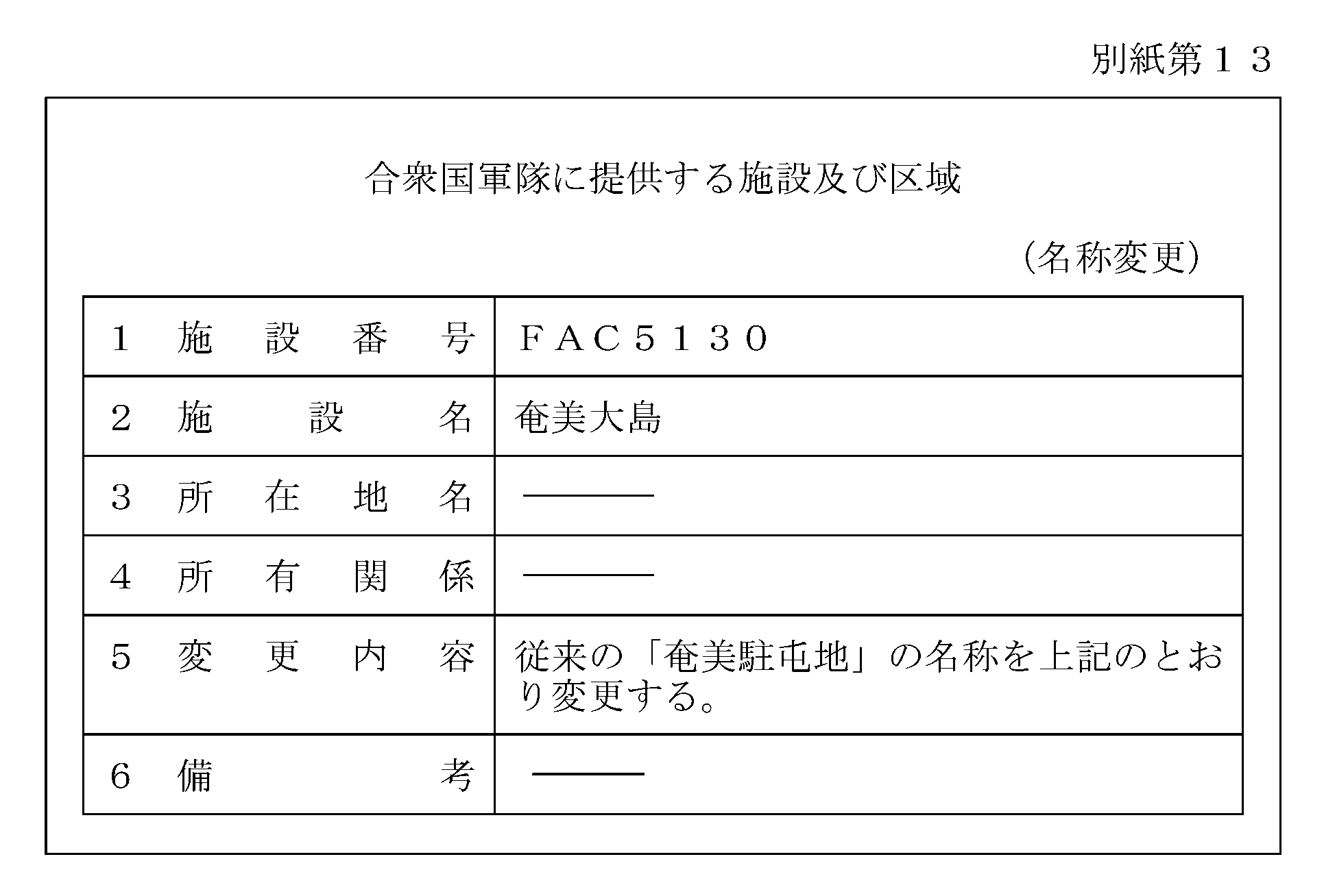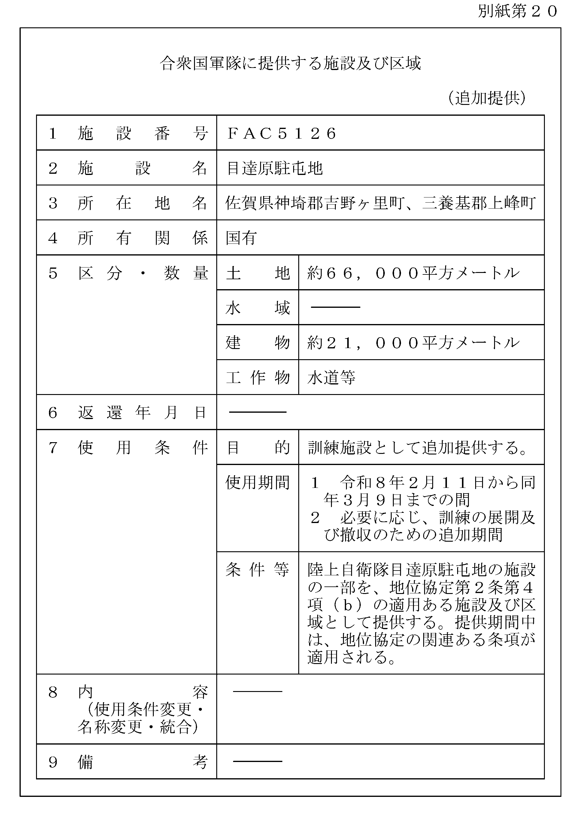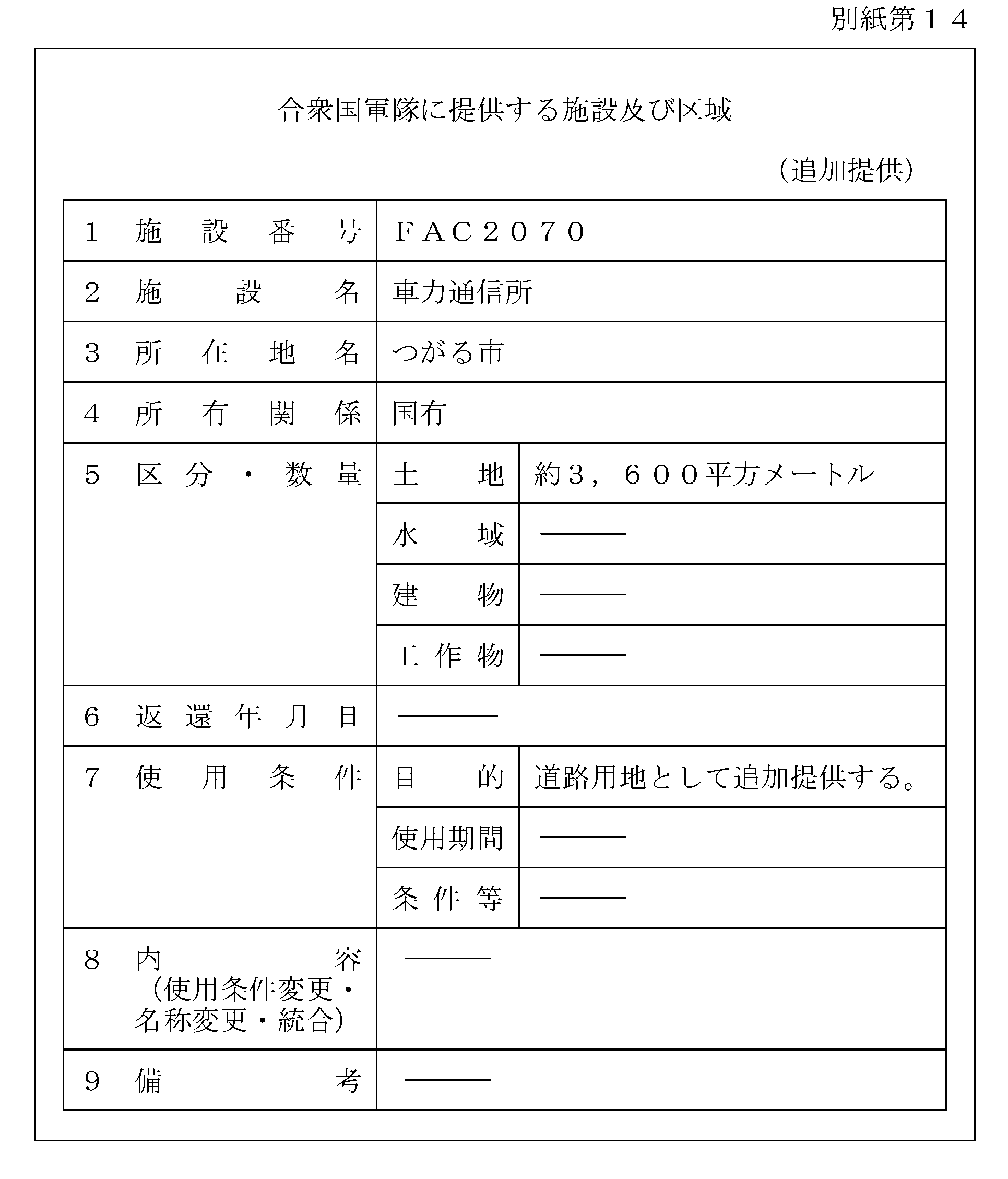1960年1月19日ワシントンで署名された「日本国とアメリカ合衆国との間の相互協力及び安全保障条約第六条に基づく施設及び区域並びに日本国における合衆国軍隊の地位に関する協定」第2条に基づきアメリカ合衆国が使用を許される施設及び区域について、共同使用、名称変更、追加提供及び新規提供を別添のとおり決定することとする。