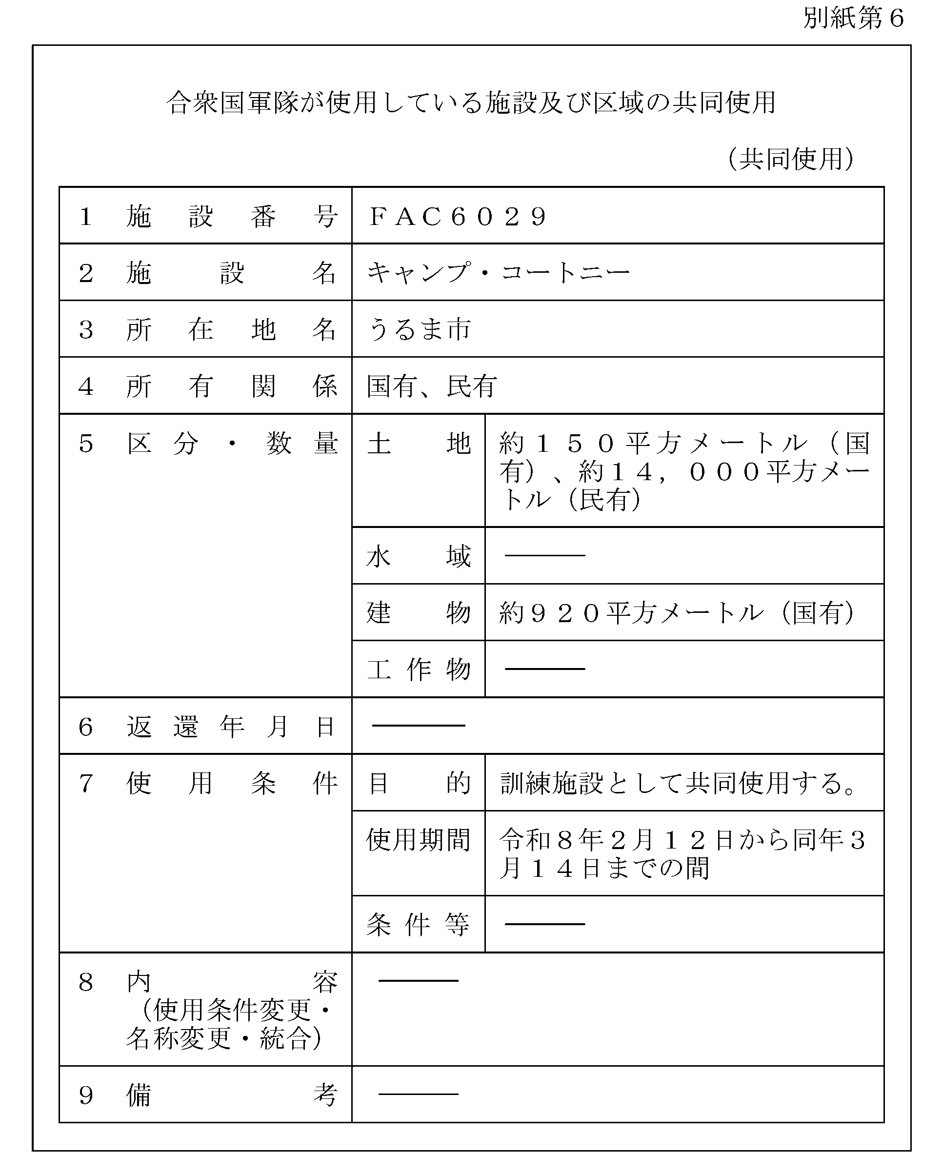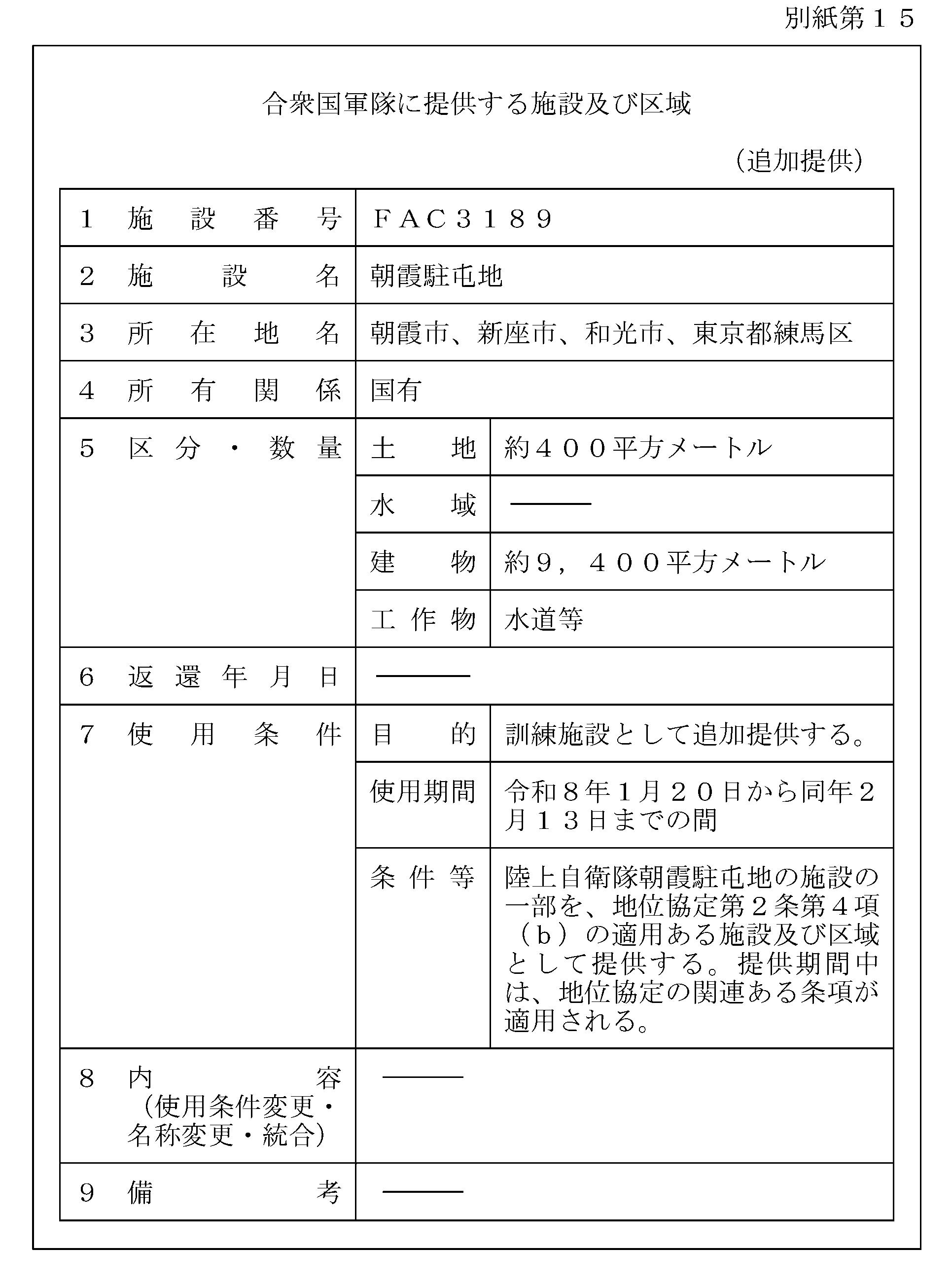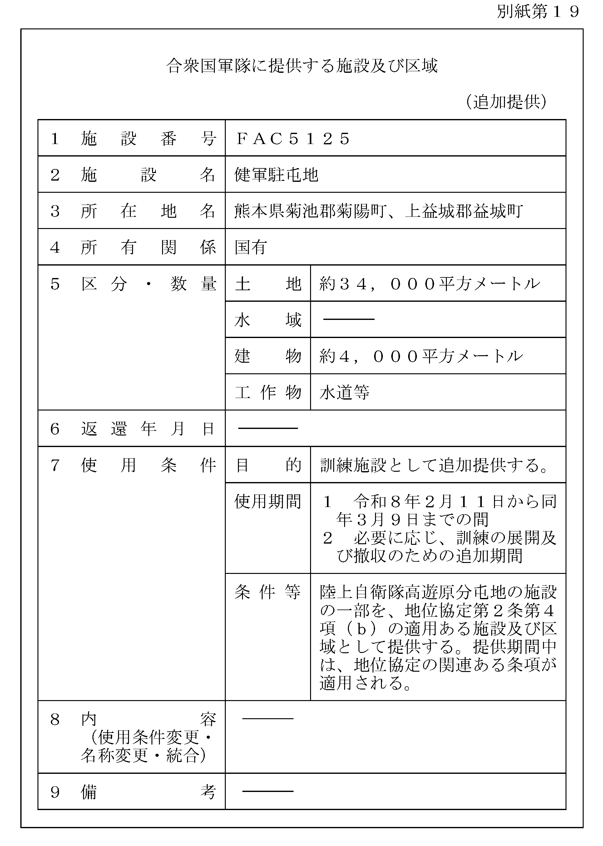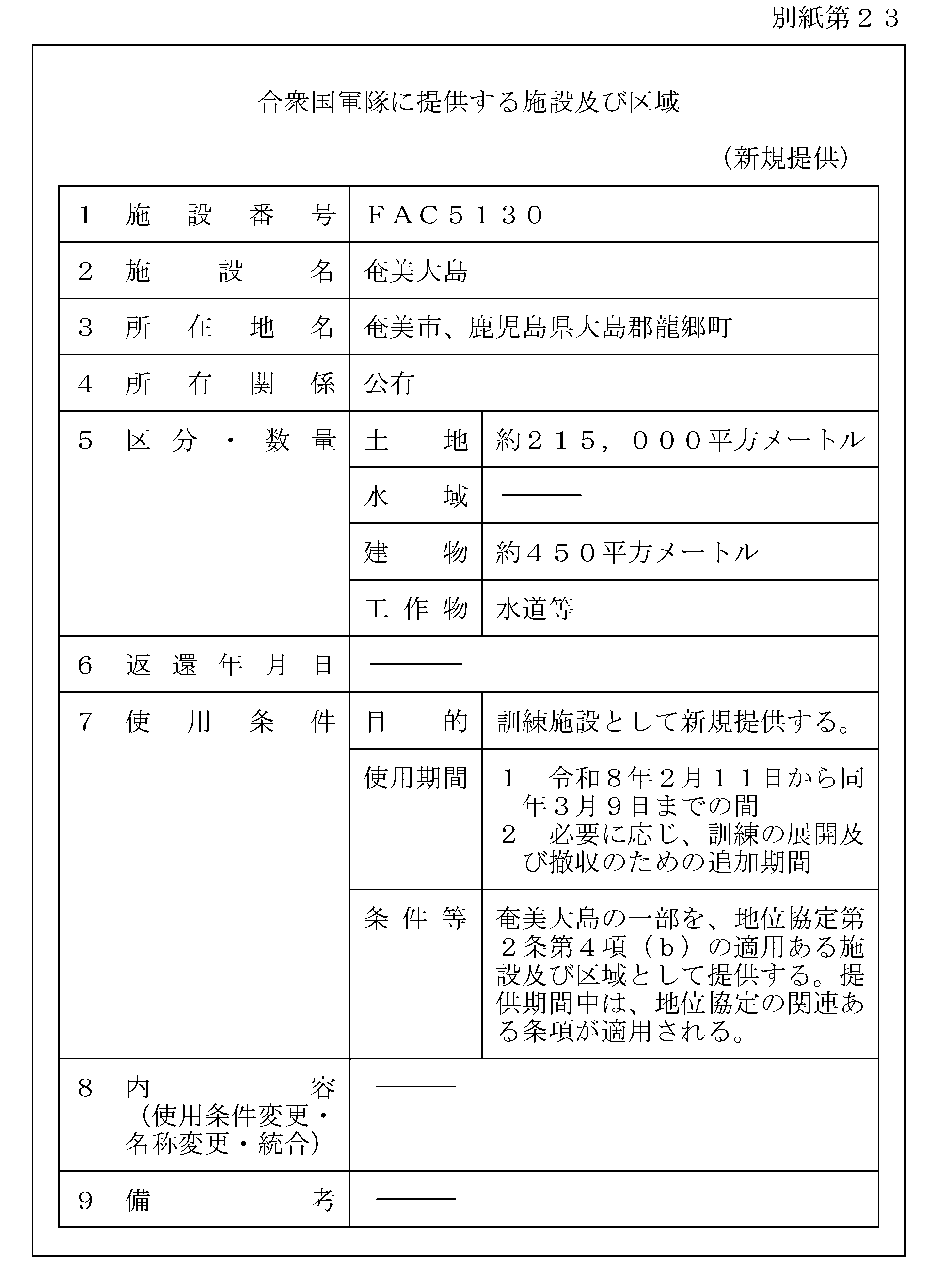 1960年1月19日ワシントンで署名された「日本国とアメリカ合衆国との間の相互協力及び安全保障条約第六条に基づく施設及び区域並びに日本国における合衆国軍隊の地位に関する協定」第2条に基づきアメリカ合衆国が使用を許される施設及び区域について、共同使用、名称変更、追加提供及び新規提供を別添のとおり決定することとする。