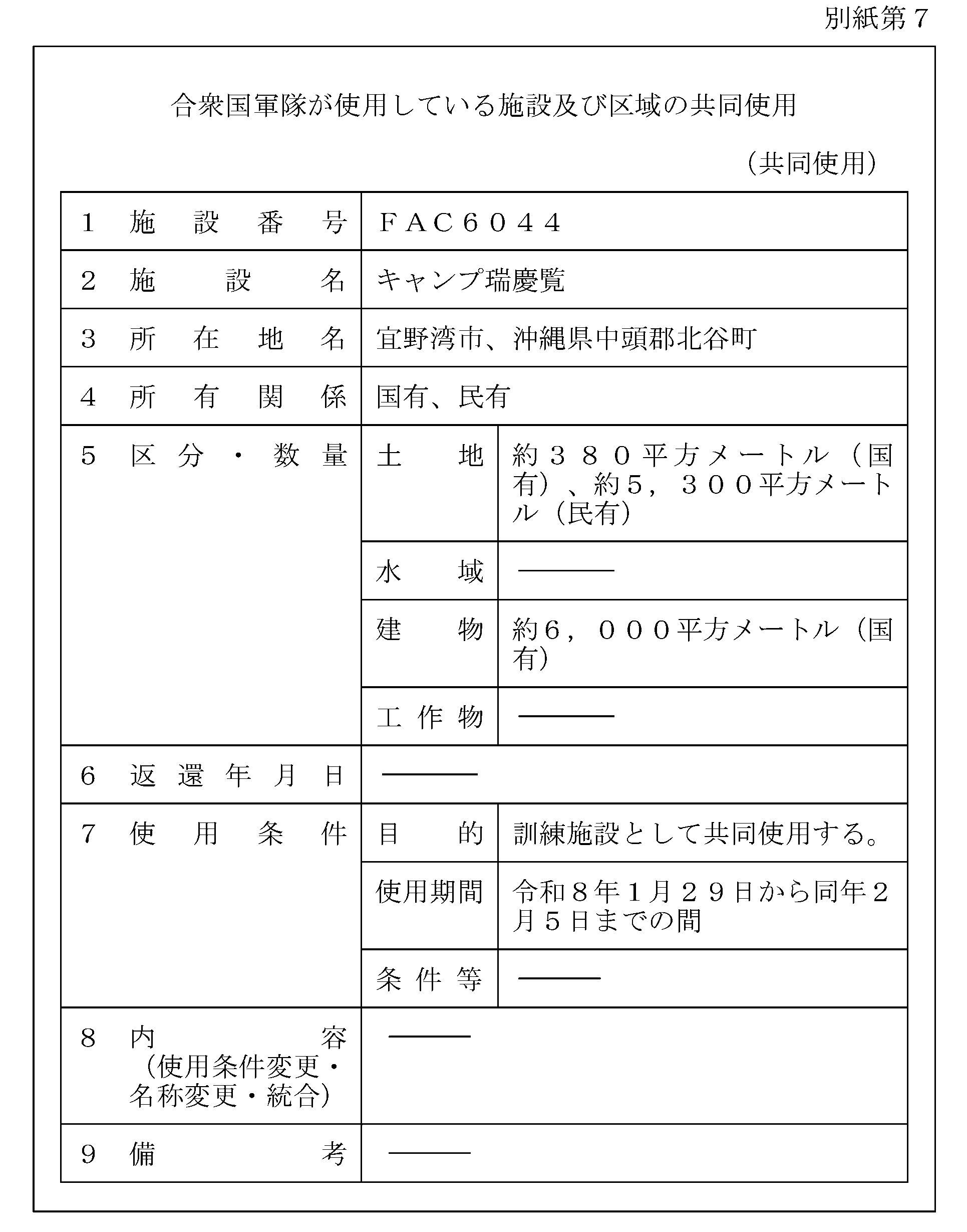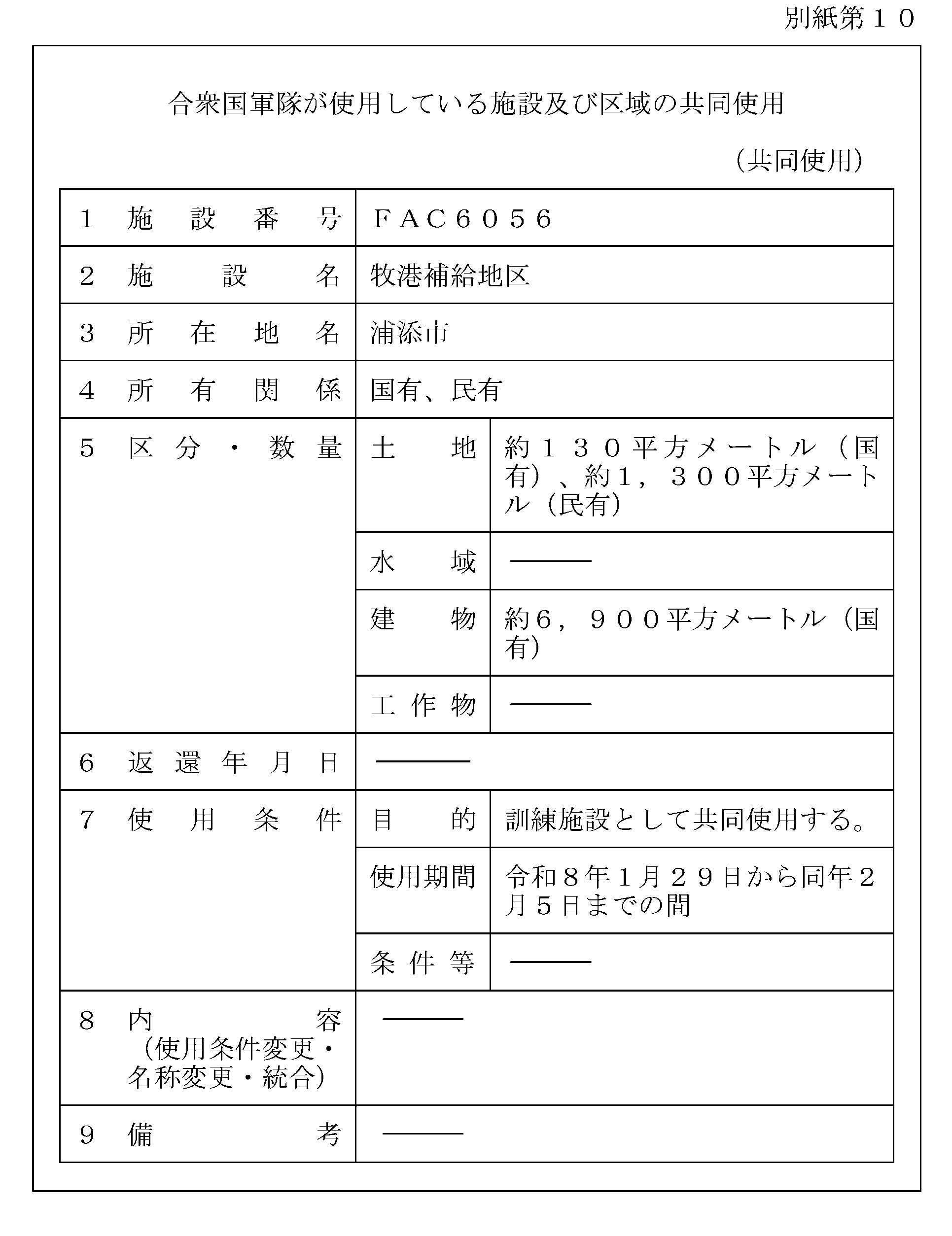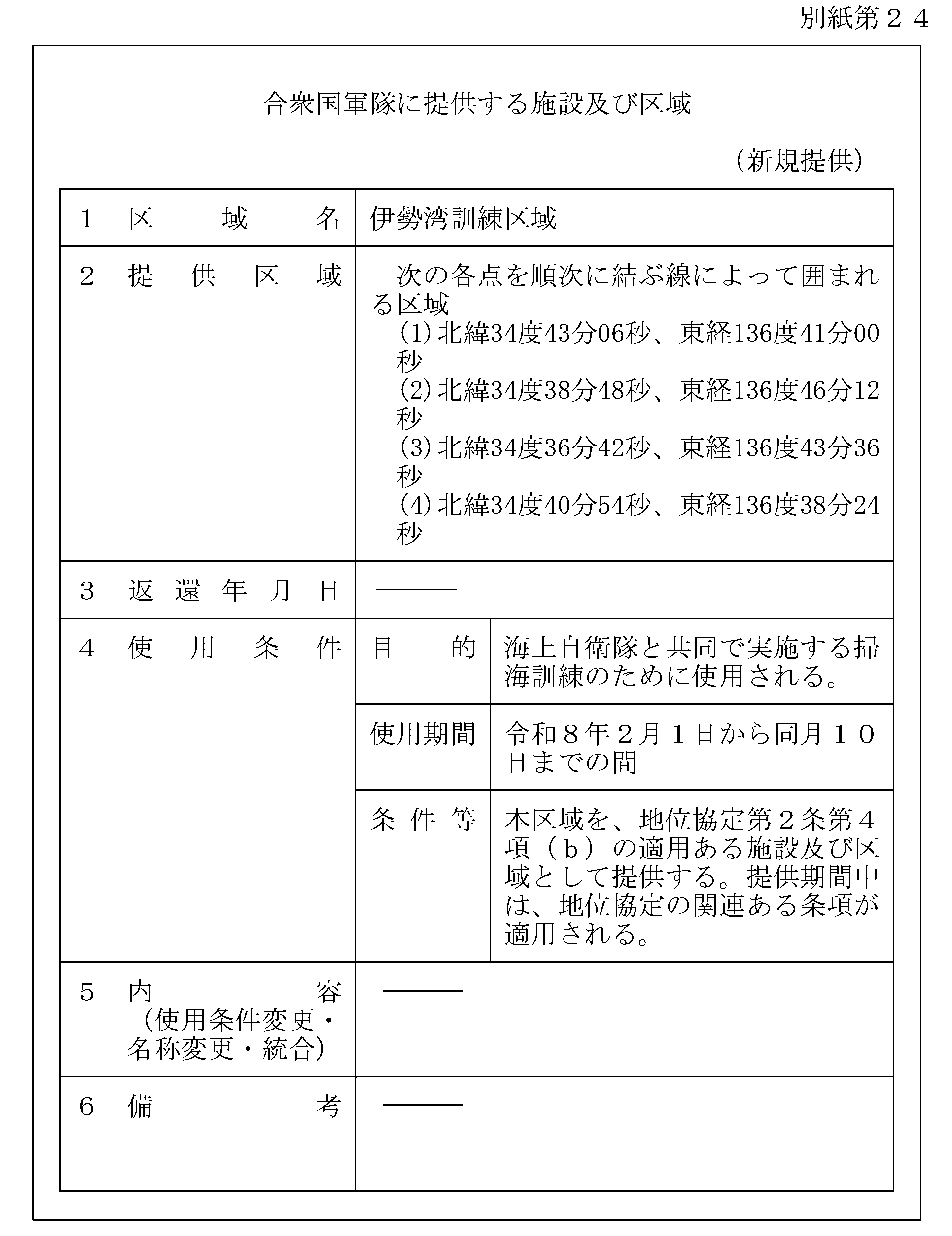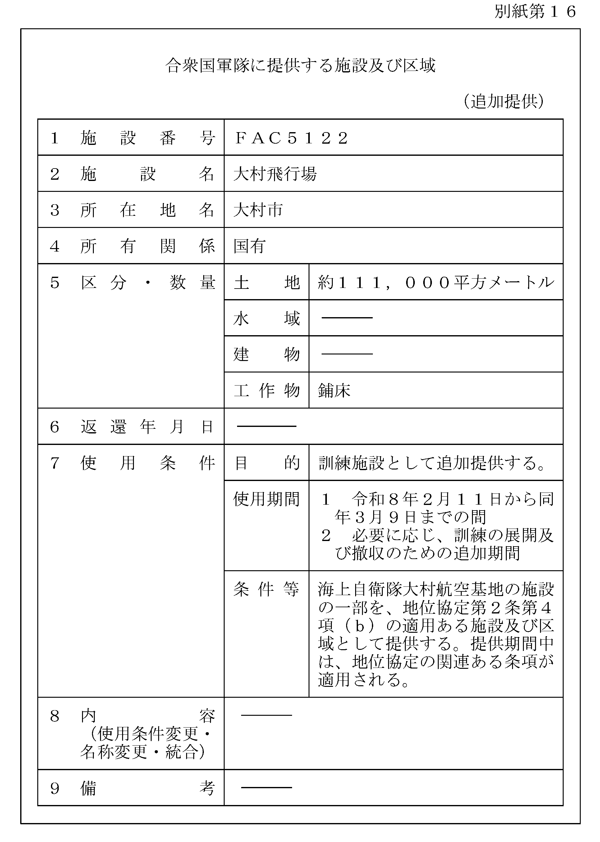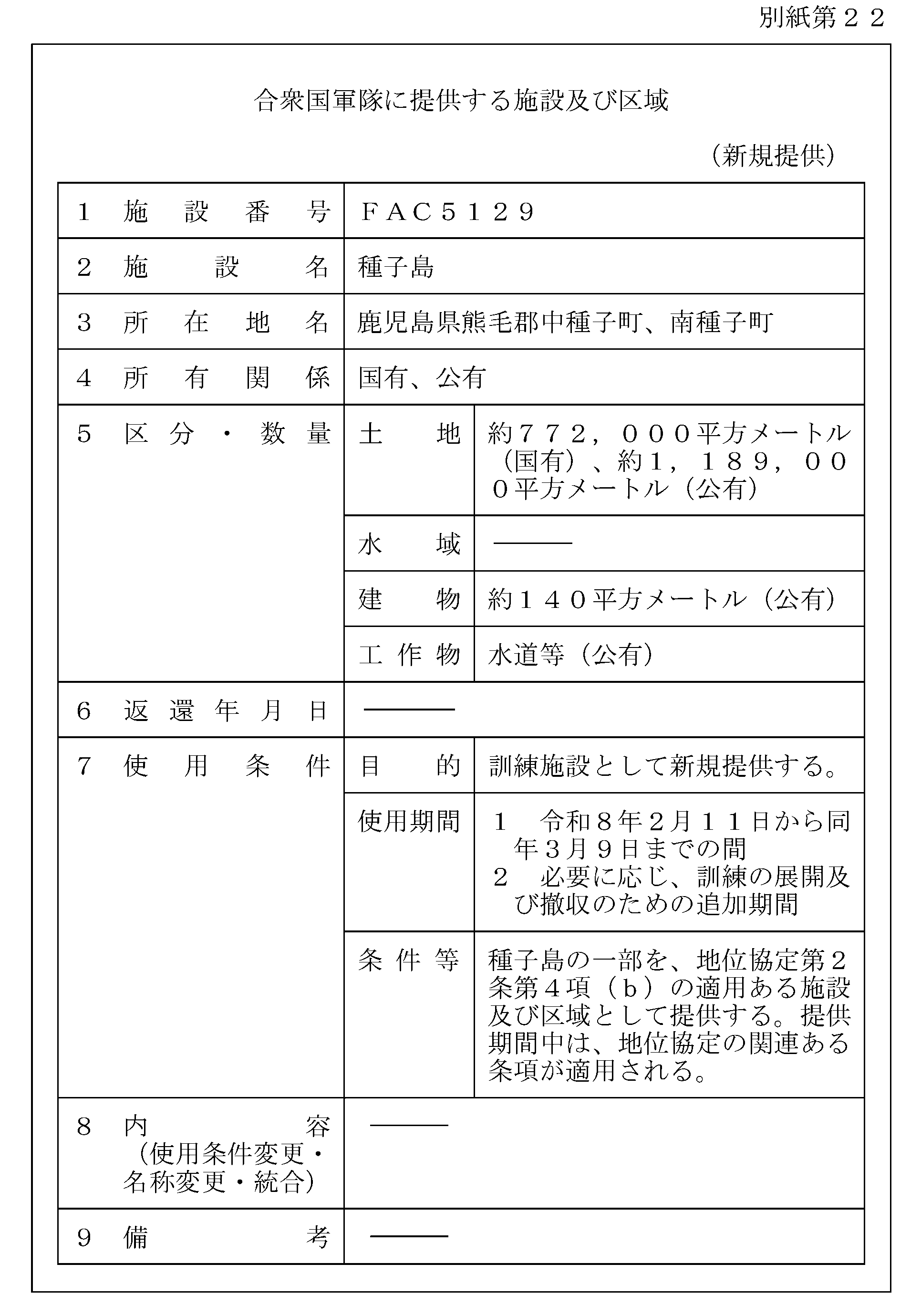 1960年1月19日ワシントンで署名された「日本国とアメリカ合衆国との間の相互協力及び安全保障条約第六条に基づく施設及び区域並びに日本国における合衆国軍隊の地位に関する協定」第2条に基づきアメリカ合衆国が使用を許される施設及び区域について、共同使用、名称変更、追加提供及び新規提供を別添のとおり決定することとする。
