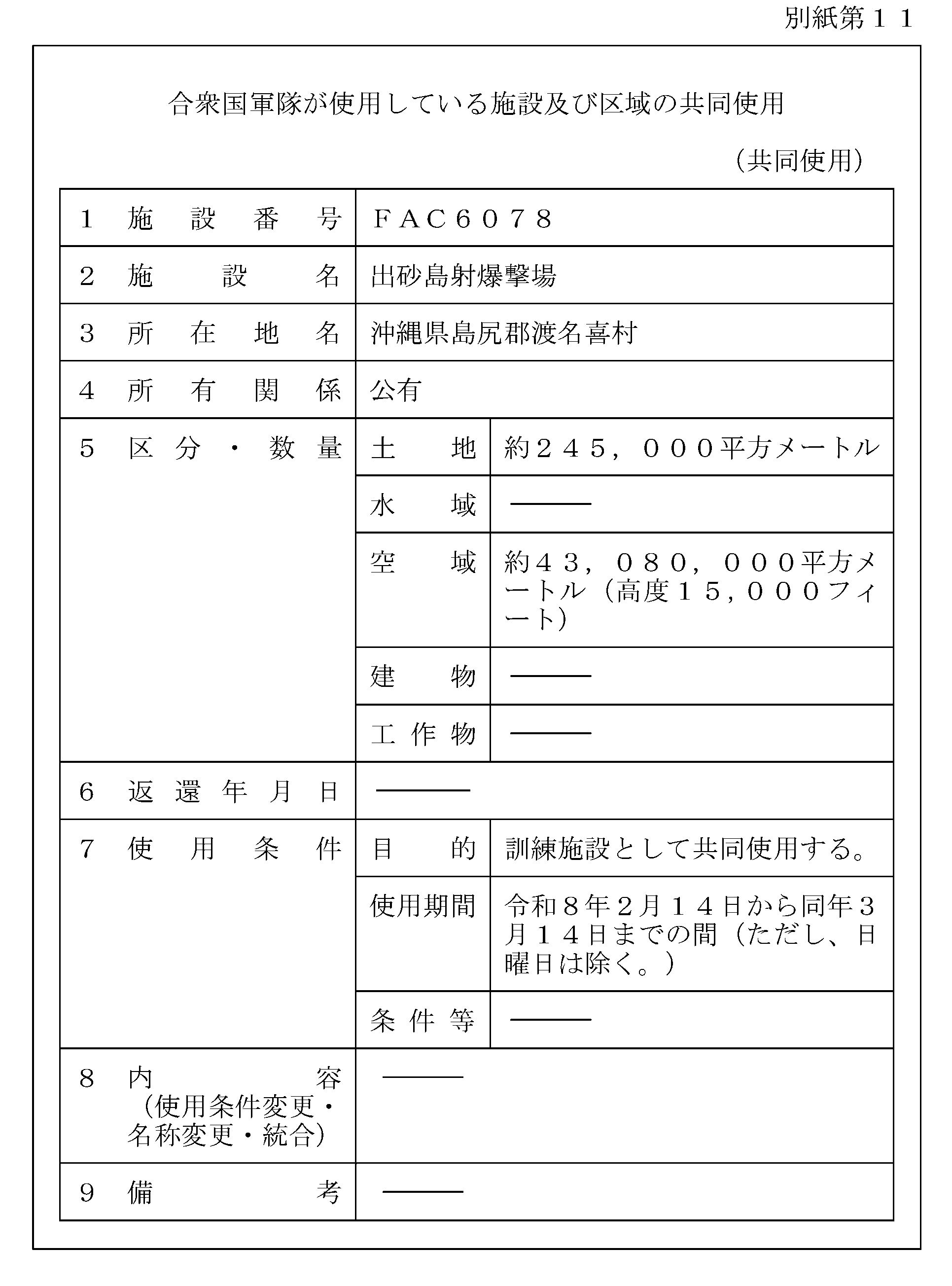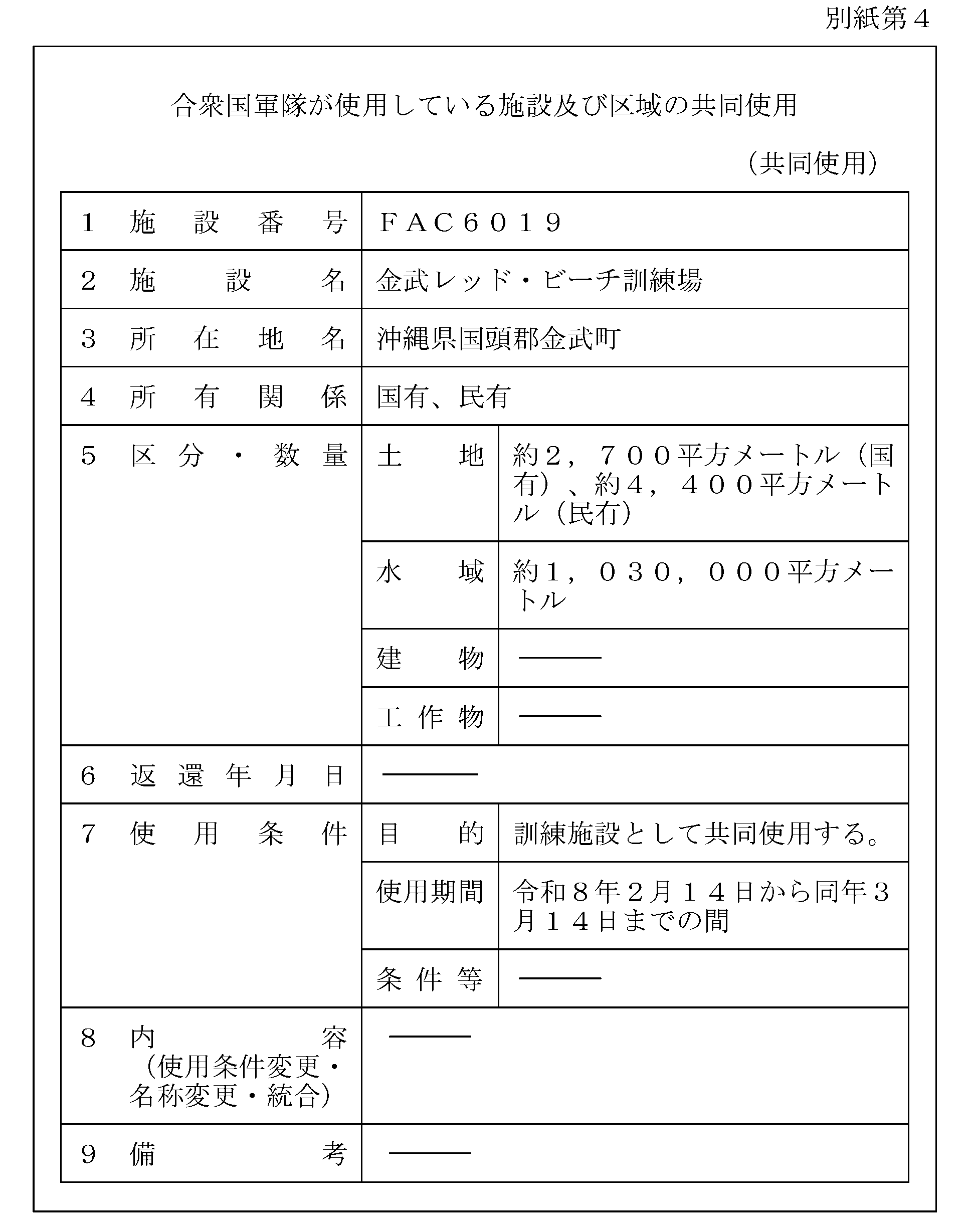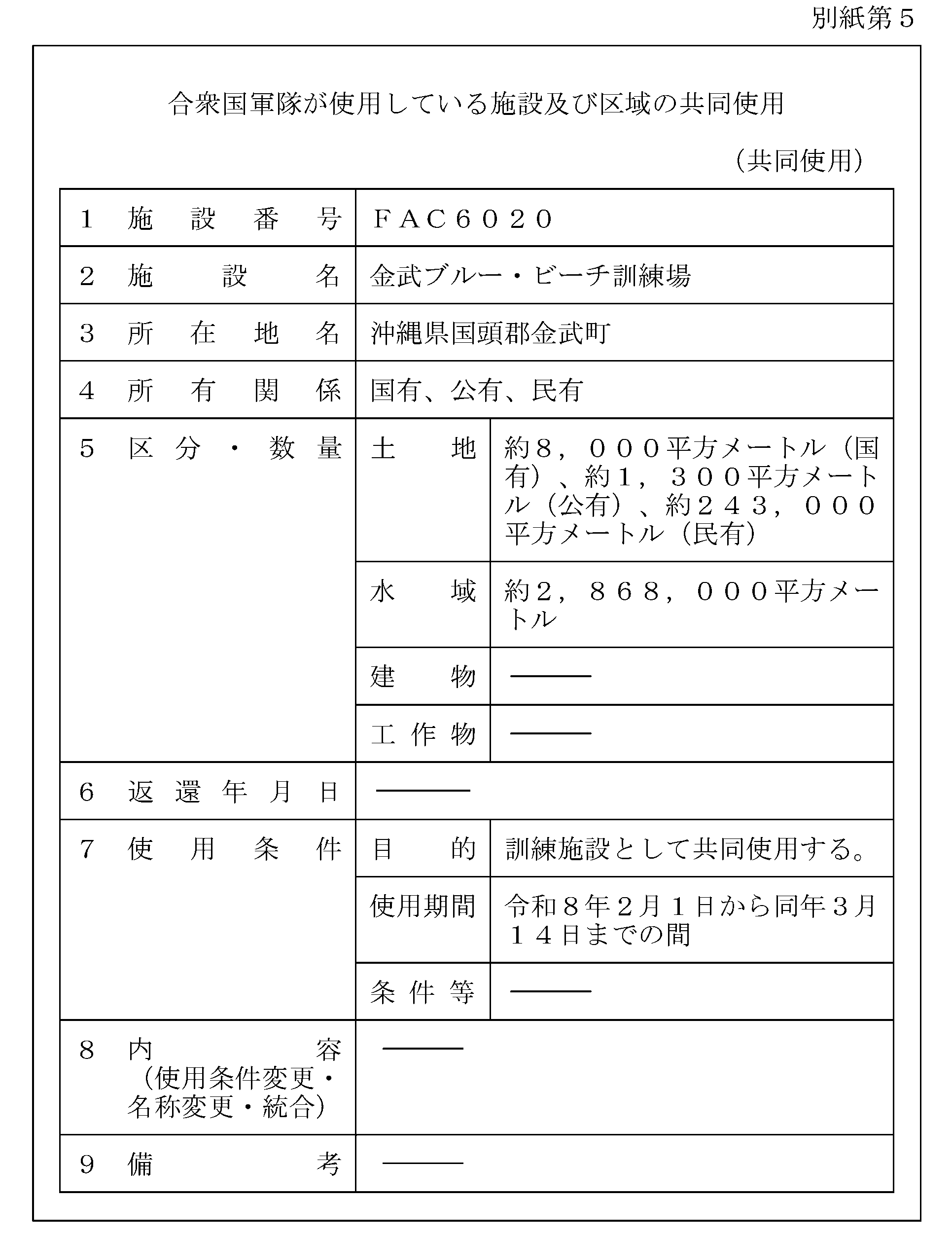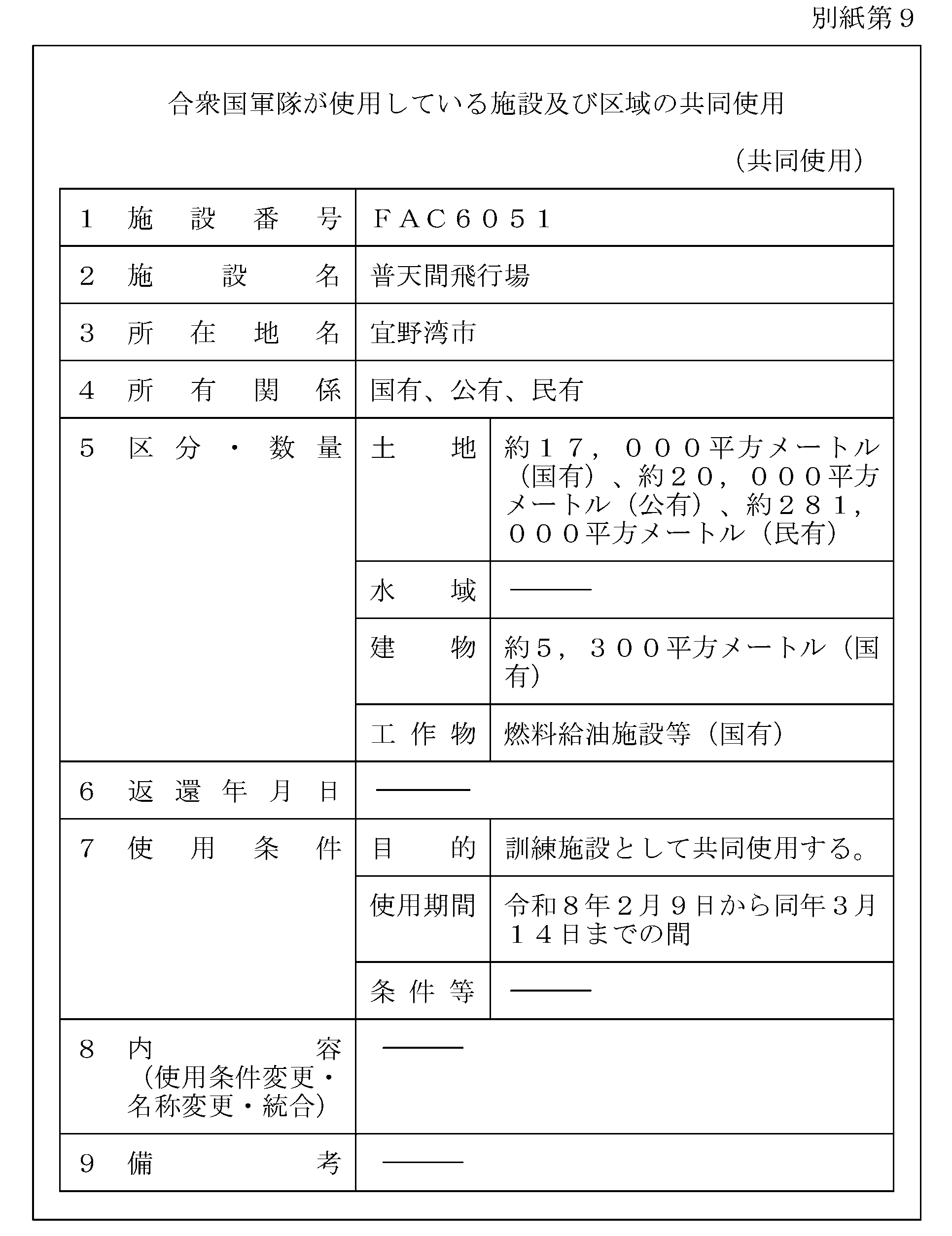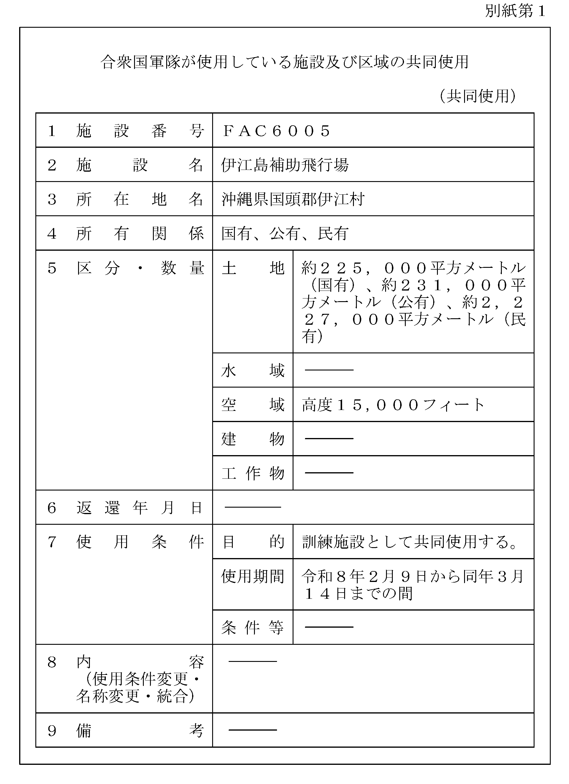 1960年1月19日ワシントンで署名された「日本国とアメリカ合衆国との間の相互協力及び安全保障条約第六条に基づく施設及び区域並びに日本国における合衆国軍隊の地位に関する協定」第2条に基づきアメリカ合衆国が使用を許される施設及び区域について、共同使用、名称変更、追加提供及び新規提供を別添のとおり決定することとする。