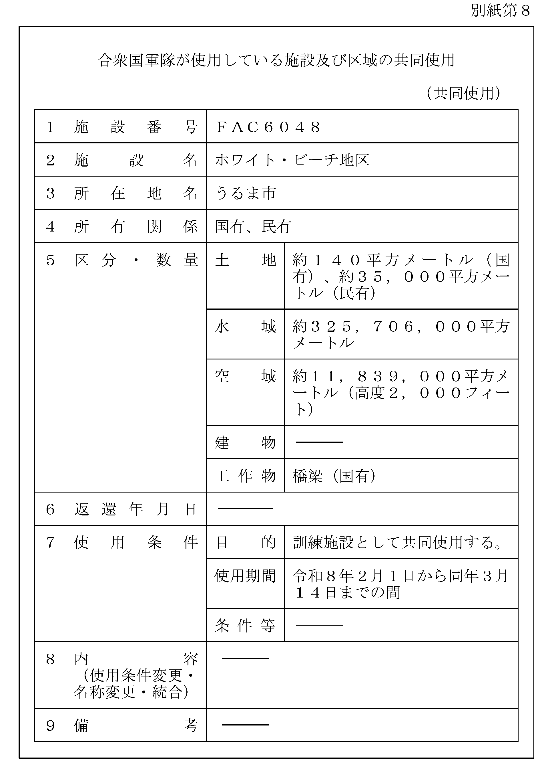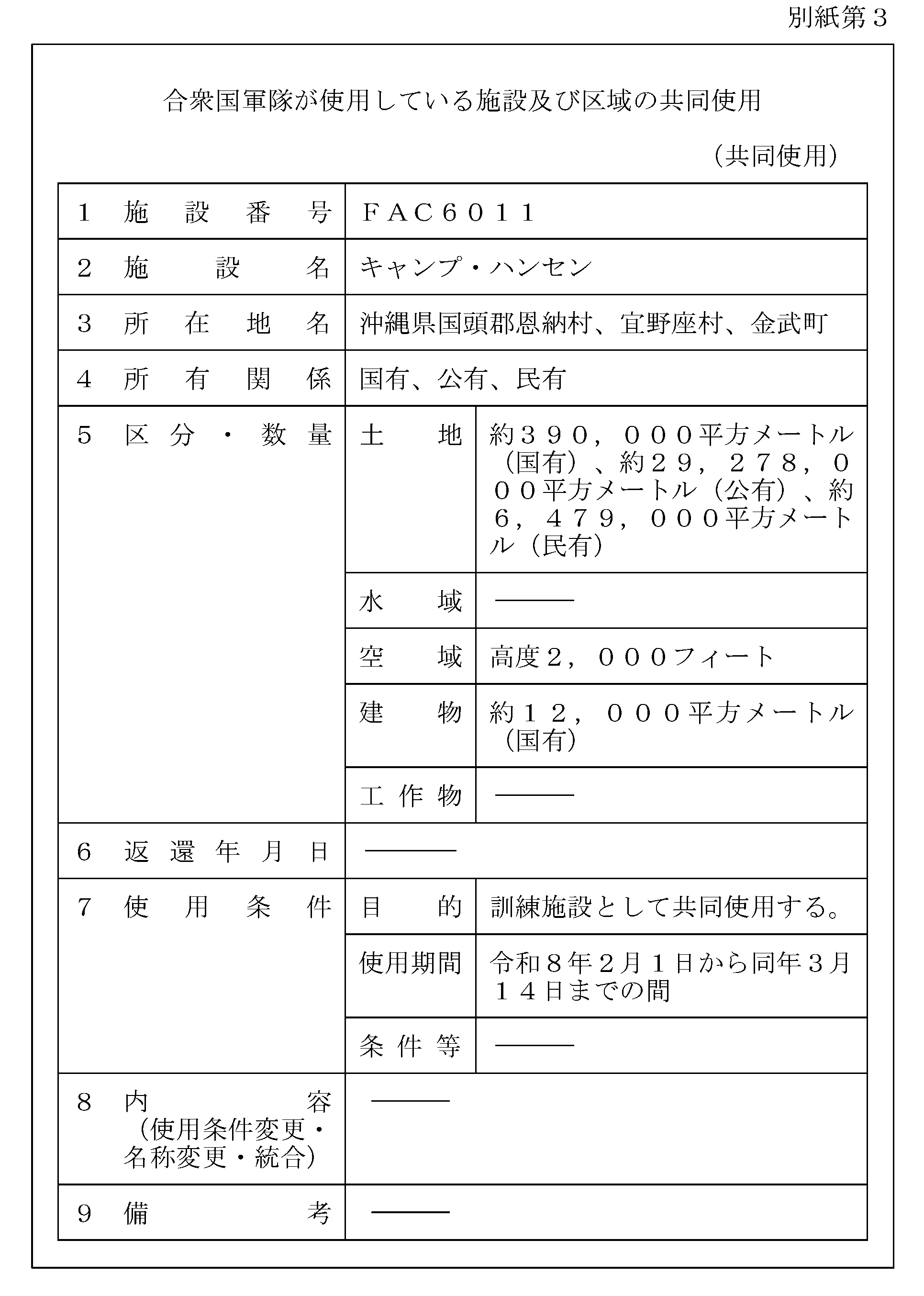 「日本国とアメリカ合衆国との間の相互協力及び安全保障条約第六条に基づく施設及び区域並びに日本国における合衆国軍隊の地位に関する協定」第2条に基づく施設及び区域の共同使用、名称変更、追加提供及び新規提供について