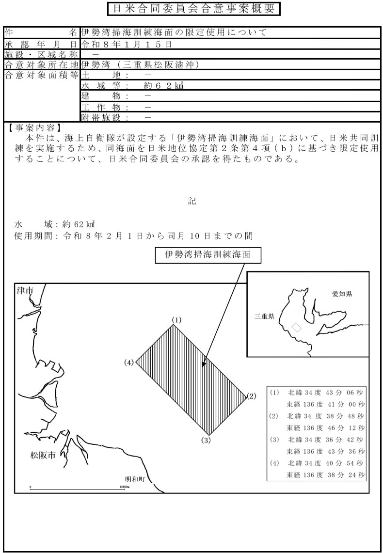 日米合同委員会において、伊勢湾掃海訓練海面の限定使用について合意しましたのでお知らせします。