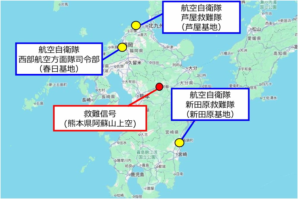 ○ 令和8年1月20日(火)午前、民間小型ヘリ(搭乗員3名)が、熊本県阿蘇山上空にて救難信号を発し、東京RCC(東京救難調整本部)が受信。
