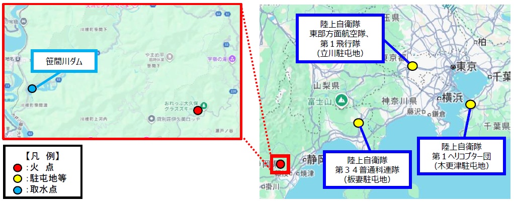 ・1月18日(日)06時50分以降、陸上自衛隊第1ヘリコプター団(木更津・千葉県)、陸上自衛隊第1飛行隊(立川・東京都)、陸上自衛隊東部方面航空隊(立川・東京都)が、空中消火活動等を実施。