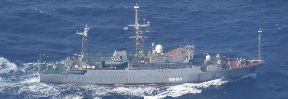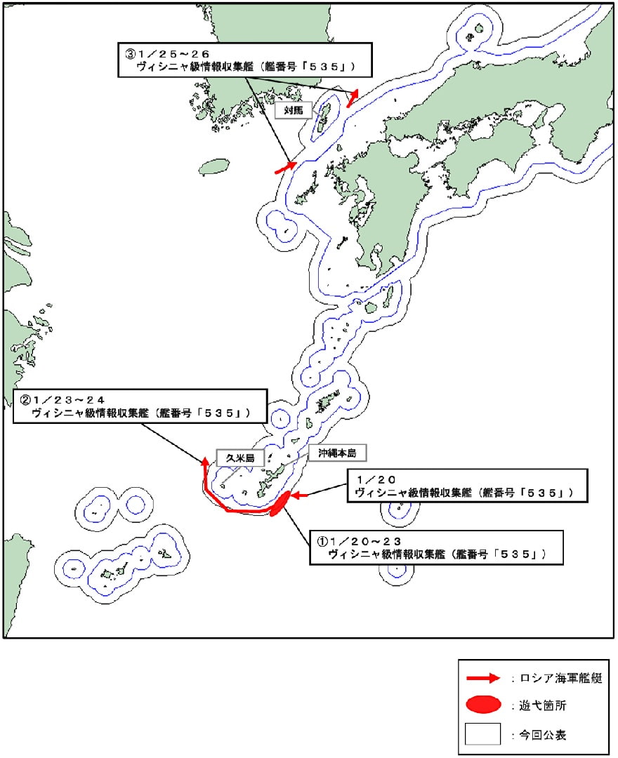 令和8年1月20日(火)午前4時頃、海上自衛隊は、沖縄本島の東約70kmの海域において、同海域を西進するロシア海軍ヴィシニャ級情報収集艦(艦番号「535」)を確認した。