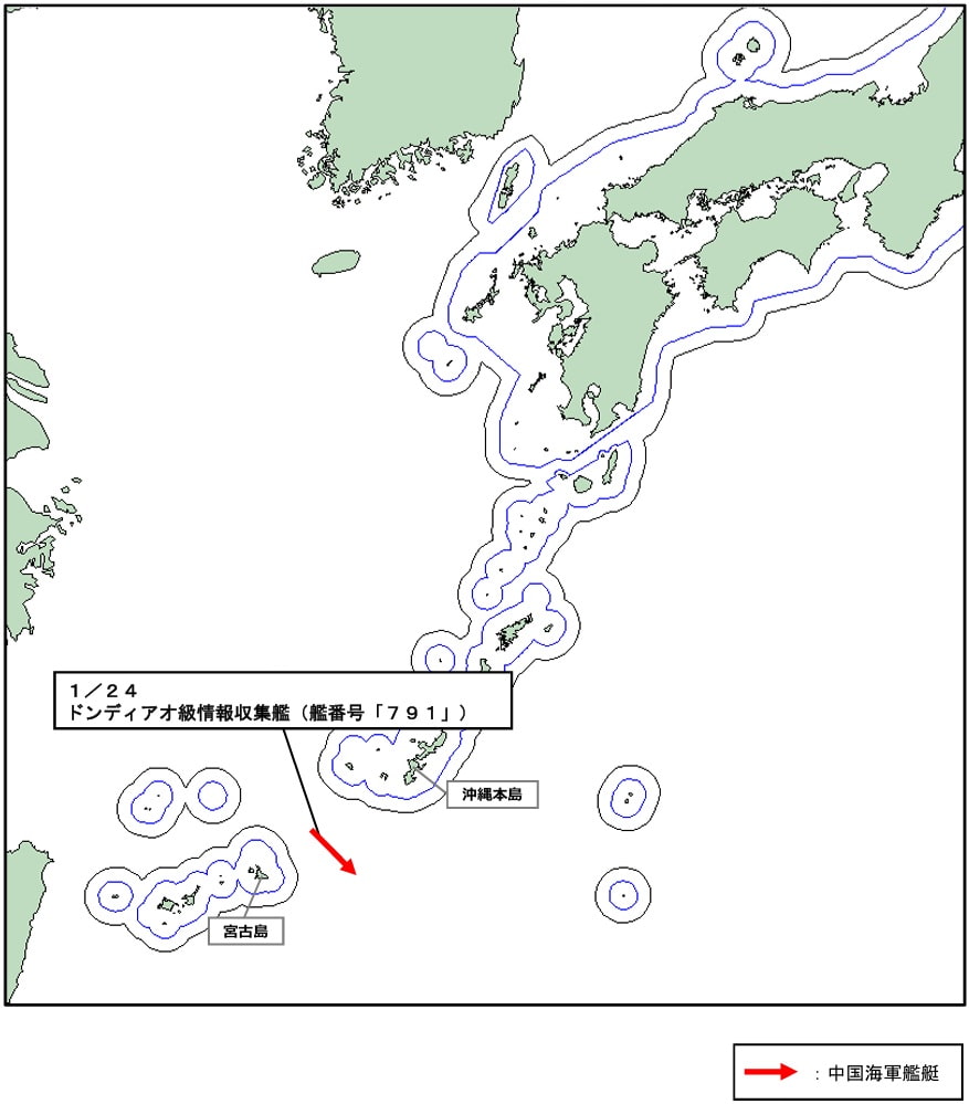 令和8年1月24日(土)正午頃、海上自衛隊は、宮古島(沖縄県)の北東約120kmの海域において、同海域を南東進する中国海軍ドンディアオ級情報収集艦(艦番号「791」)を確認した。