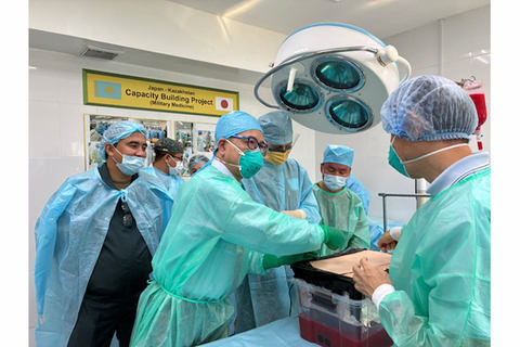 11月10日(月)~同月14日(金)の間、防衛省・自衛隊は、カザフスタン軍の医療要員に対し、衛生分野の能力向上を目的とした能力構築支援事業を実施しました。ハイブリッド型シミュレータ腹部モデル(外傷手術訓練用に開発された、豚の臓器を使用して人の腹部を再現したモデル)を使用した救命率向上のためのダメージコントロール手術に関する講義や実習、四肢損傷モデルの講義を行い、同軍の衛生分野における能力強化に貢献しました。