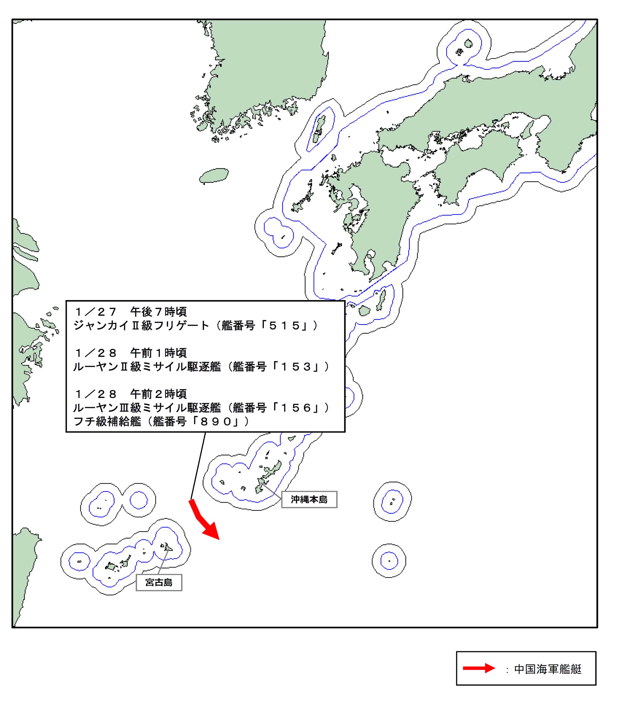 中国海軍艦4隻が沖縄本島と宮古島との間の海域を南東進(1月27~28日、ジャンカイⅡ級、ルーヤンⅡ級、ルーヤンⅢ級、フチ級)