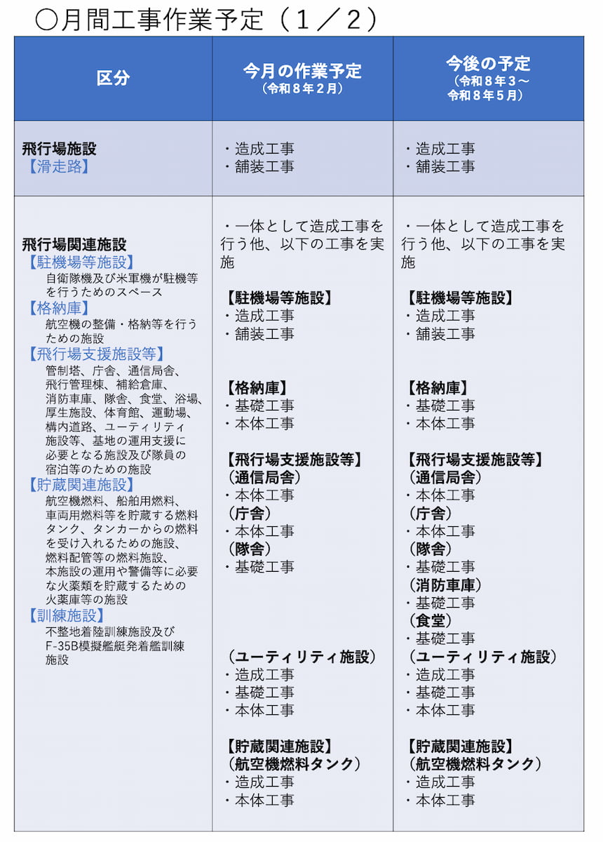 防衛省 九州防衛局は令和8(2026)年2月2日(月)、ウェブサイトにおいて、令和8年2月および令和8年3月~5月に実施する自衛隊基地の工事作業と環境保全措置等の予定を公表した。あわせて施設整備状況の写真を公開した。