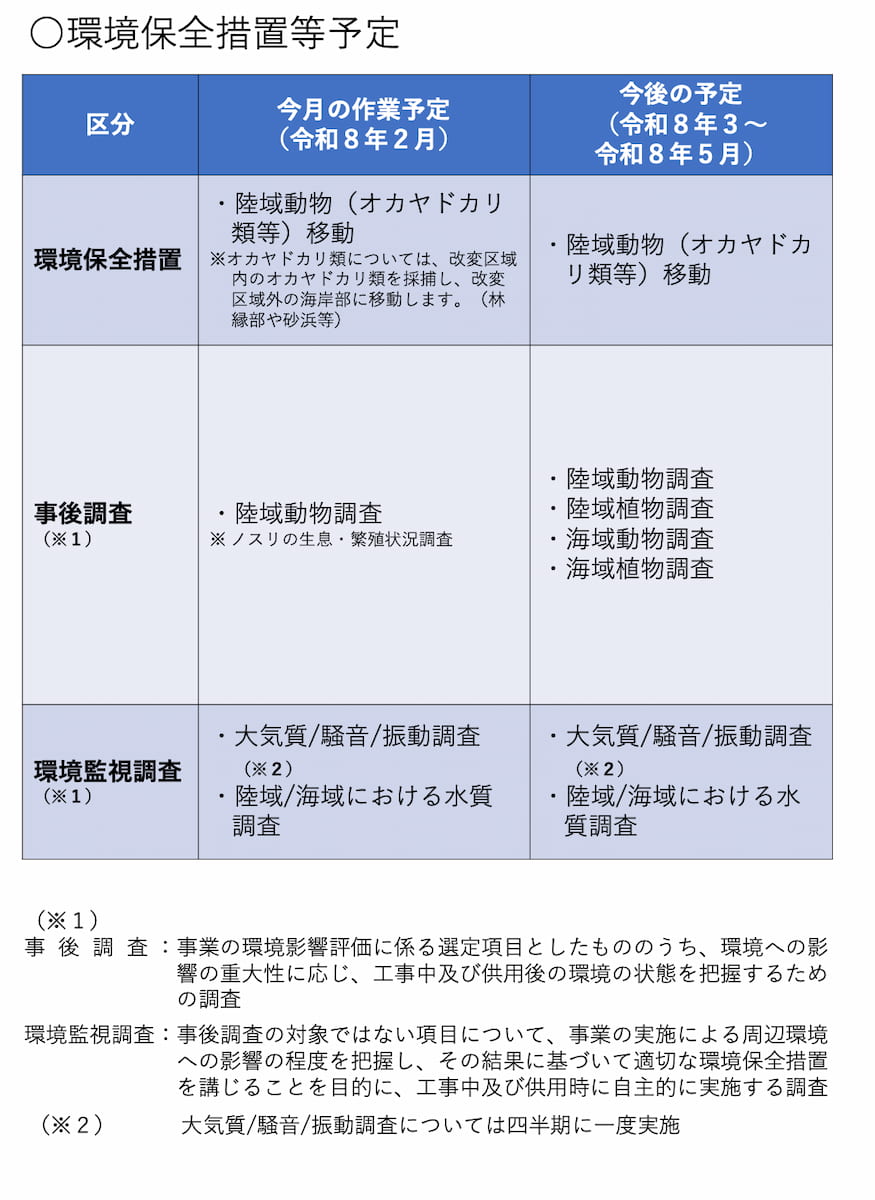 2月には以下の工事と環境保全措置等が予定されている。各工事の詳細や、今後の工事予定については、記事末尾の九州防衛局の公表資料を参照されたい。