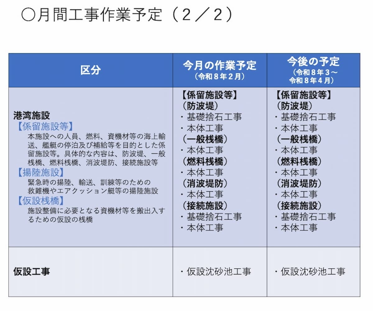 | 港湾施設 | 係留施設等 | 本施設への人員、燃料、資機材等の海上輸送、艦艇の停泊及び補給等を目的とした係留施設等。具体的な内容は、防波堤、一般桟橋、燃料桟橋、消波堤防、接続施設等 |