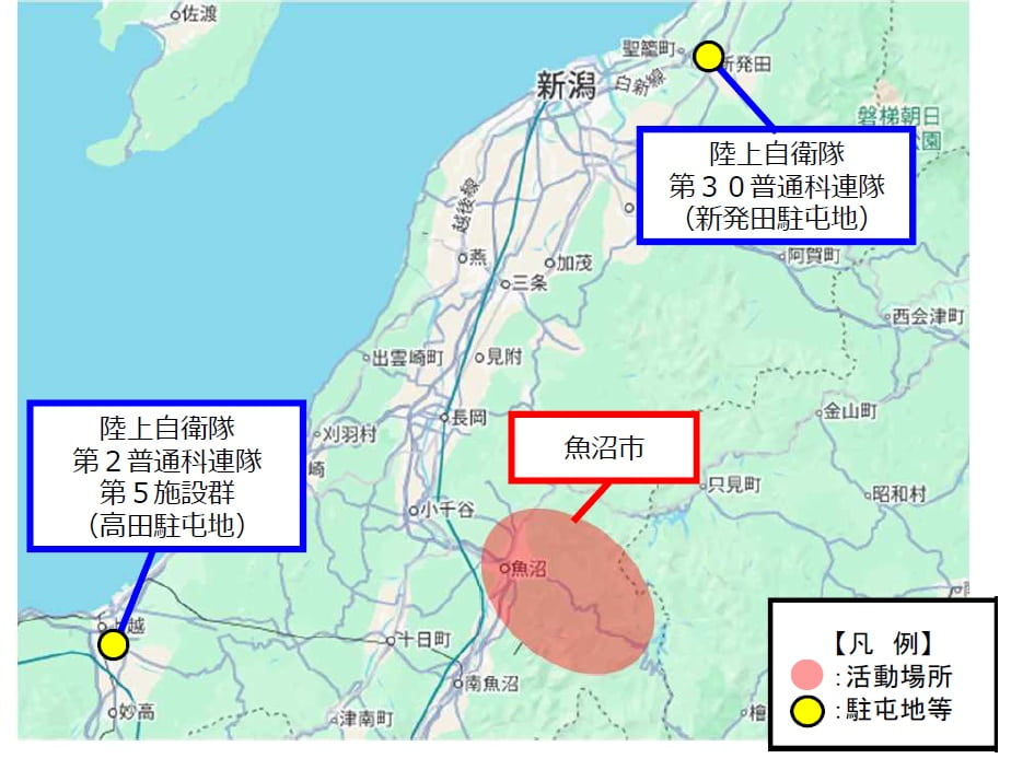 ○ 本日(11日)12時00分、じ後の対応は自治体等のみで可能となったことから、新潟県知事から第12旅団長に対し、災害派遣撤収要請があり、活動を終了。