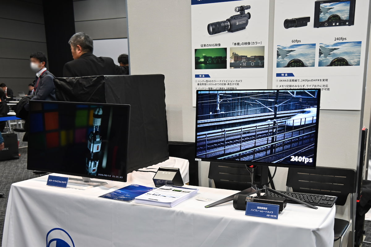 会場には、超高感度のカラーハンディカメラと、8Kの解像度で毎秒240コマ(fps)という驚異的なフレームレートを持つハンディカメラを展示した。星明かりでの監視任務や高速移動体の撮影など、防衛・警備分野における高度な眼としての活用の可能性を示唆した。