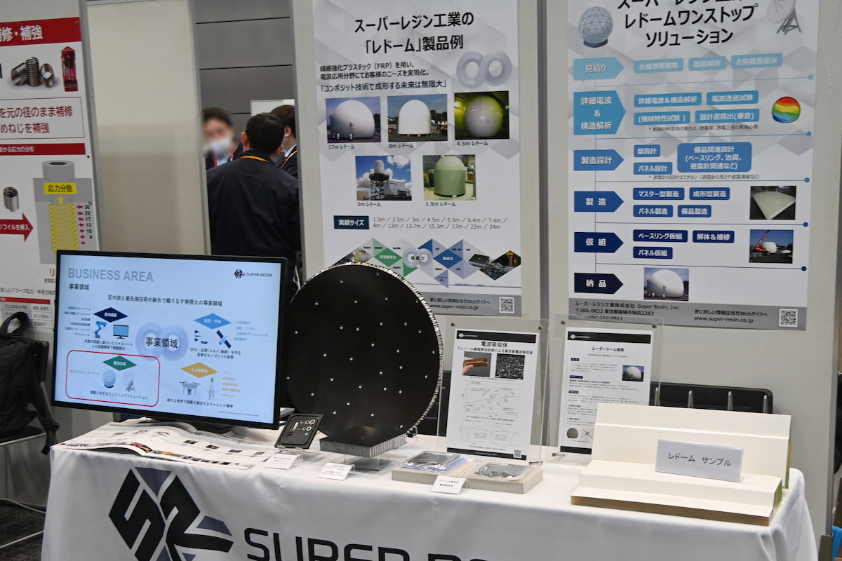 ブースでは実際のレドームで用いられるGFRP(ガラス繊維強化プラスチック)や人工衛星に用いられるCFRP(炭素繊維強化プラスチック)、電波吸収体のサンプルなどを展示し、これらの技術基盤・製造基盤を国内にも持っておくことの重要性を強調した。