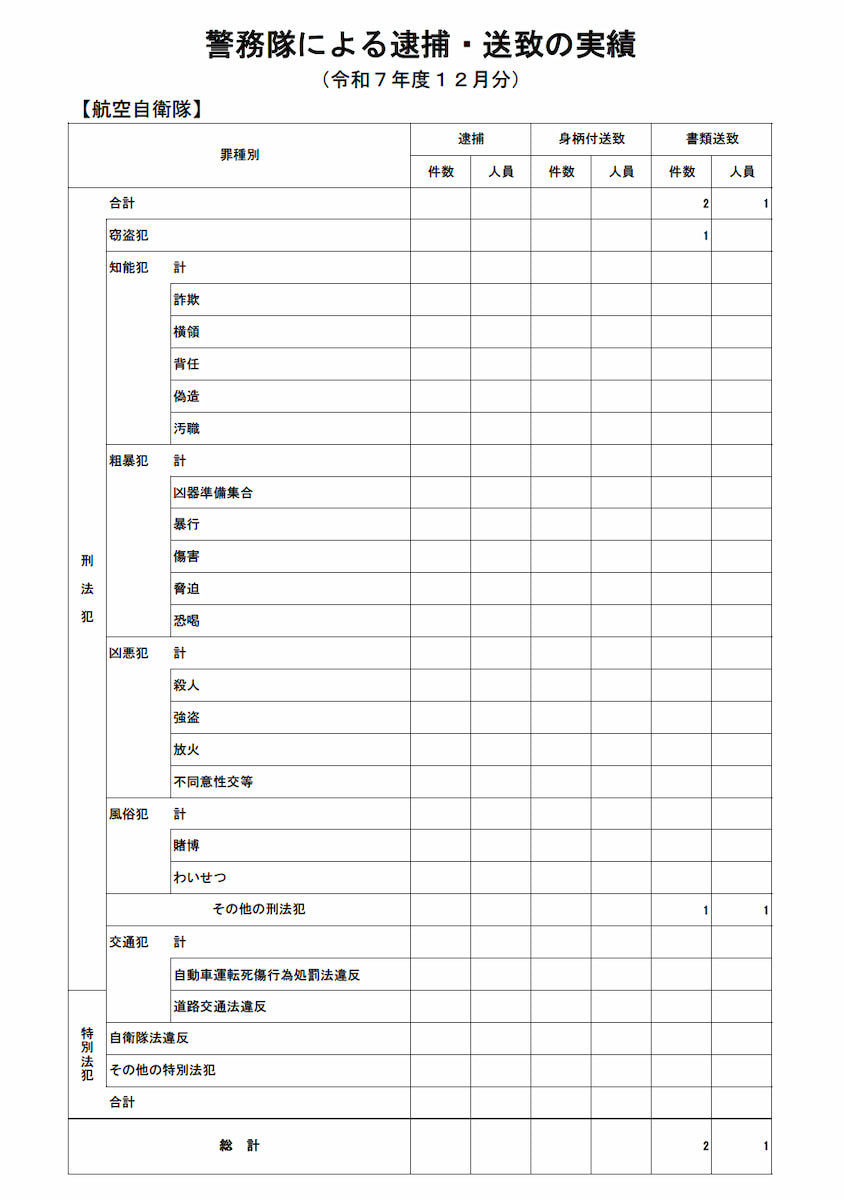 防衛省 航空幕僚監部は令和8(2026)年2月13日(金)15時00分、令和7(2025)年12月の警務隊による逮捕・送致の実績について以下のように公表した。