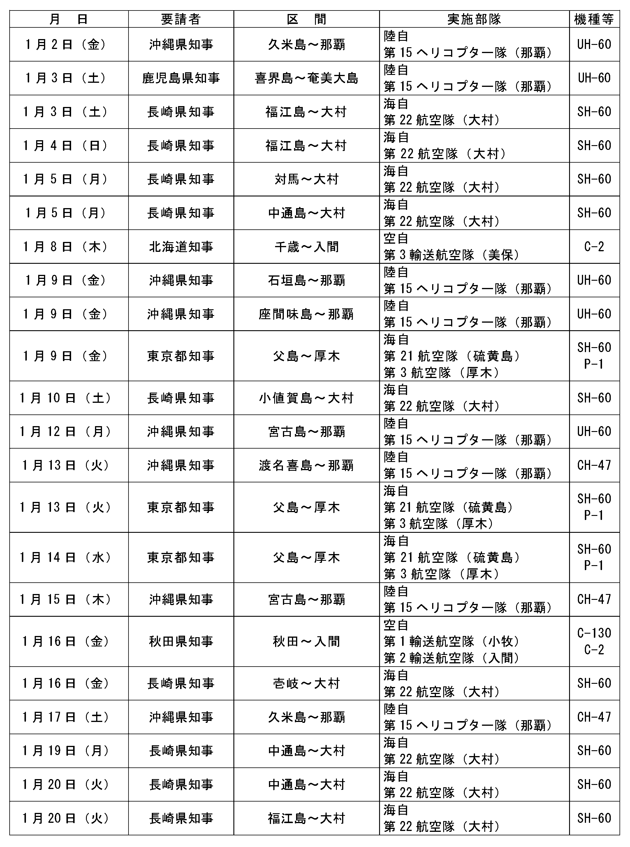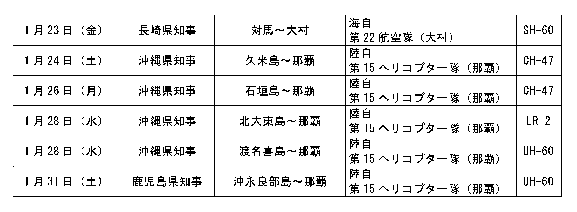 防衛省 統合幕僚監部は令和8(2026)年2月13日(金)15時00分、令和8年1月の急患輸送実績について公表した。詳細は以下のとおり。
