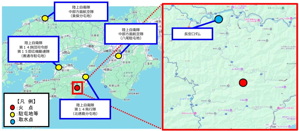 ○ 2月18日(水)08時40分以降、陸上自衛隊第14飛行隊(北徳島・徳島県)、陸上自衛隊中部方面航空隊(美保・鳥取県)及び陸上自衛隊中部方面航空隊(八尾・大阪府)が、空中消火等を実施。