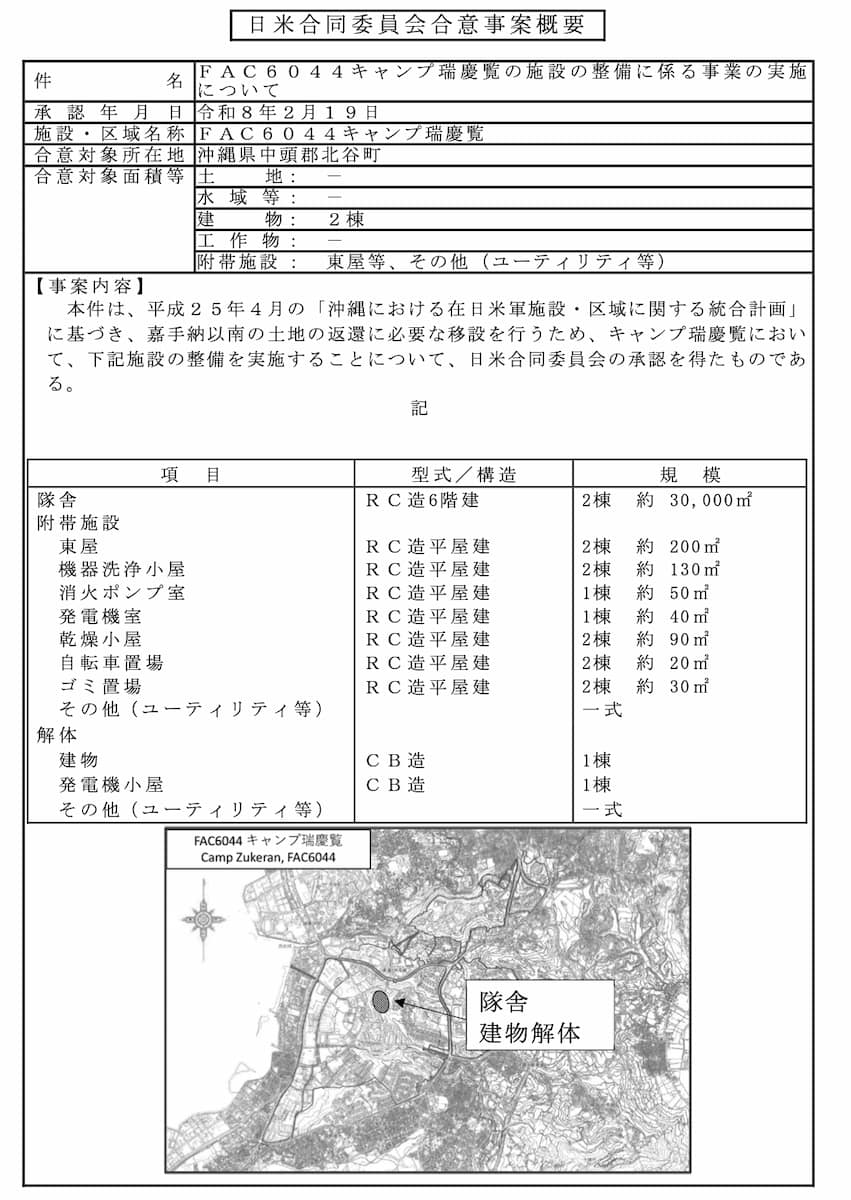 防衛省は令和8(2026)年2月19日(木)17時00分、日米合同委員会において合意した事案6件について公表した。