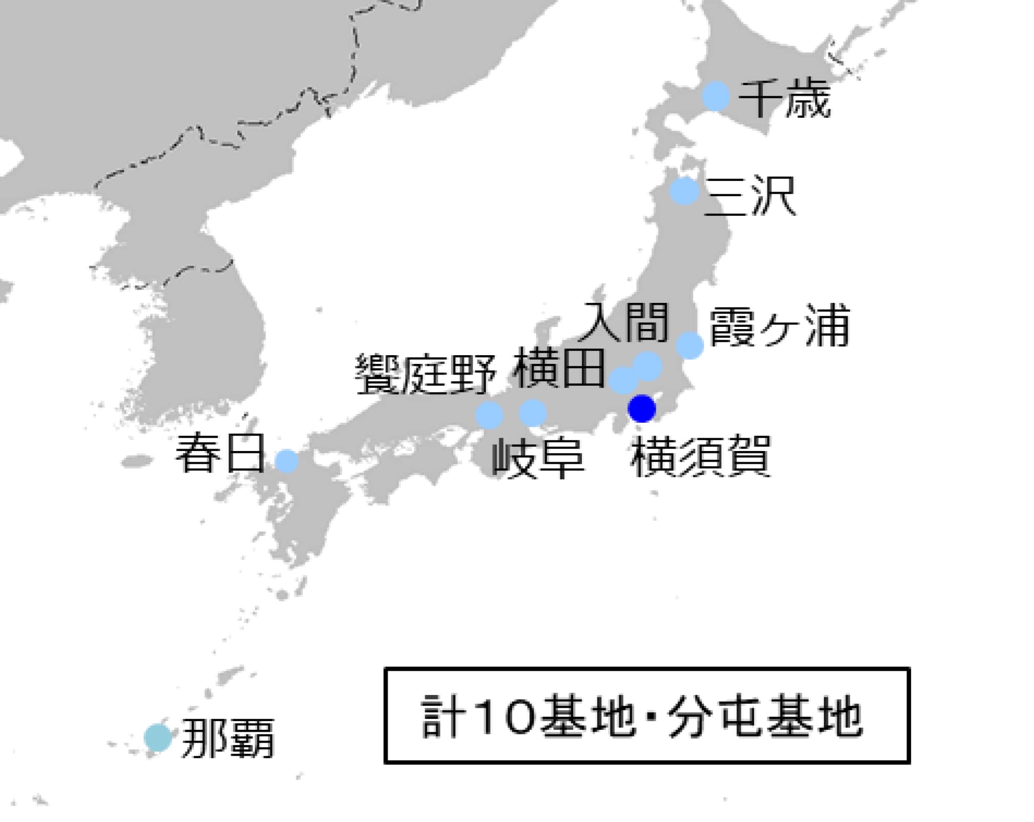 空自:千歳基地、三沢基地、横田基地、入間基地、岐阜基地、春日基地、
