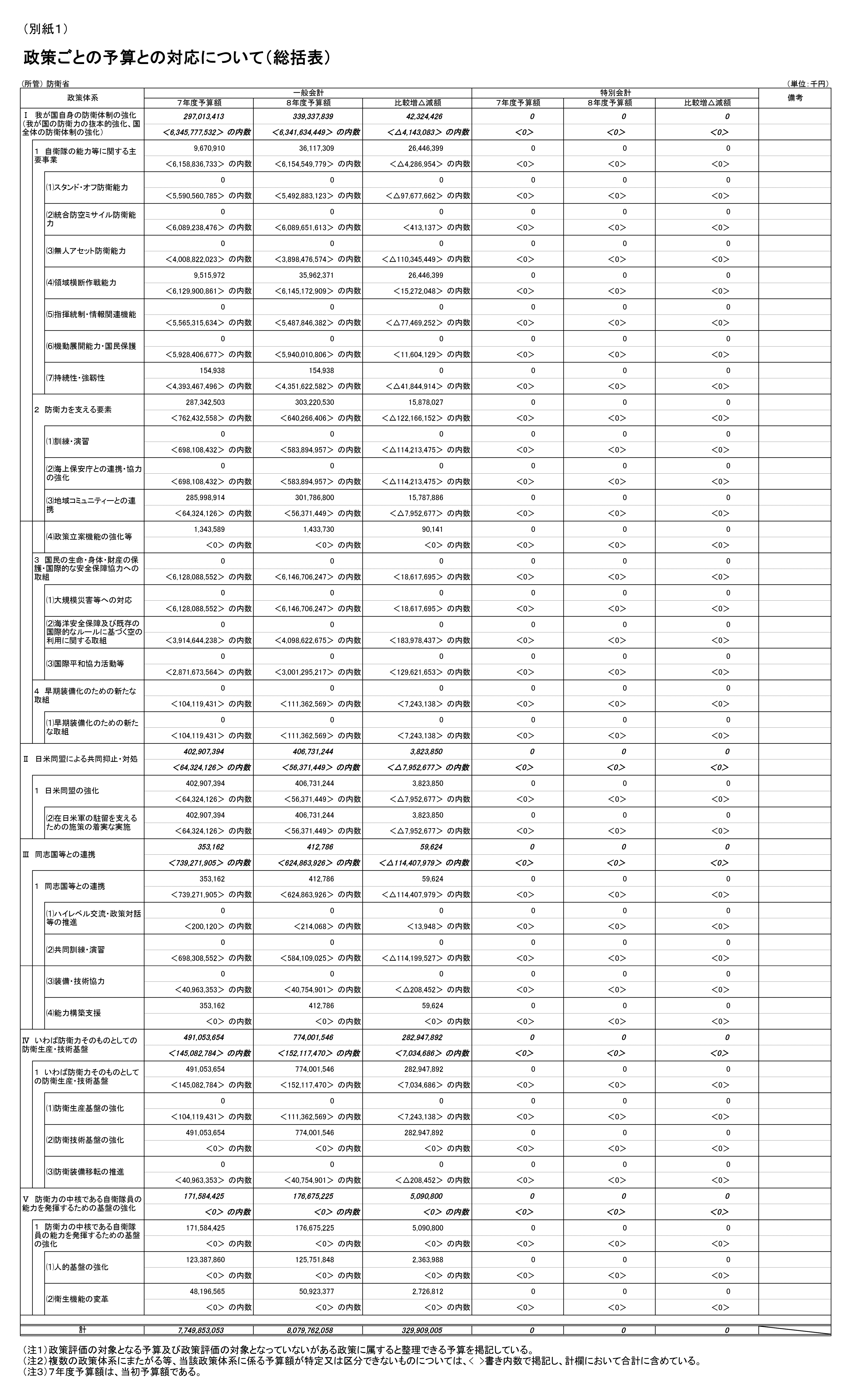 これは防衛省が実施する各施策に予算額を紐付けてリスト化したもの。総括と個別表に分かれていて、どの施策にいくら割り当てられるかがわかる(例:領域横断作戦能力は約360億円で、前年度比約264億円の増加など)。ただし、多くの事項(例:自衛官の給与など)は内数で示されているので、純粋に足し算すると8兆797億円ではとても収まらない。