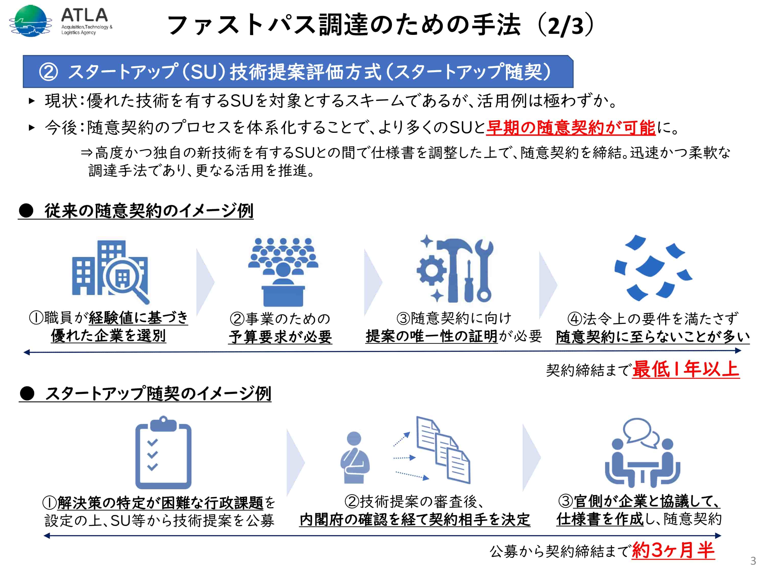 防衛省では、従来よりも遥かにスピーディーに研究開発・装備化を実現する「ファストパス調達」を活用し、スタートアップ企業等が有する優れた技術の早期の防衛装備品への取り込みを進めてまいります。