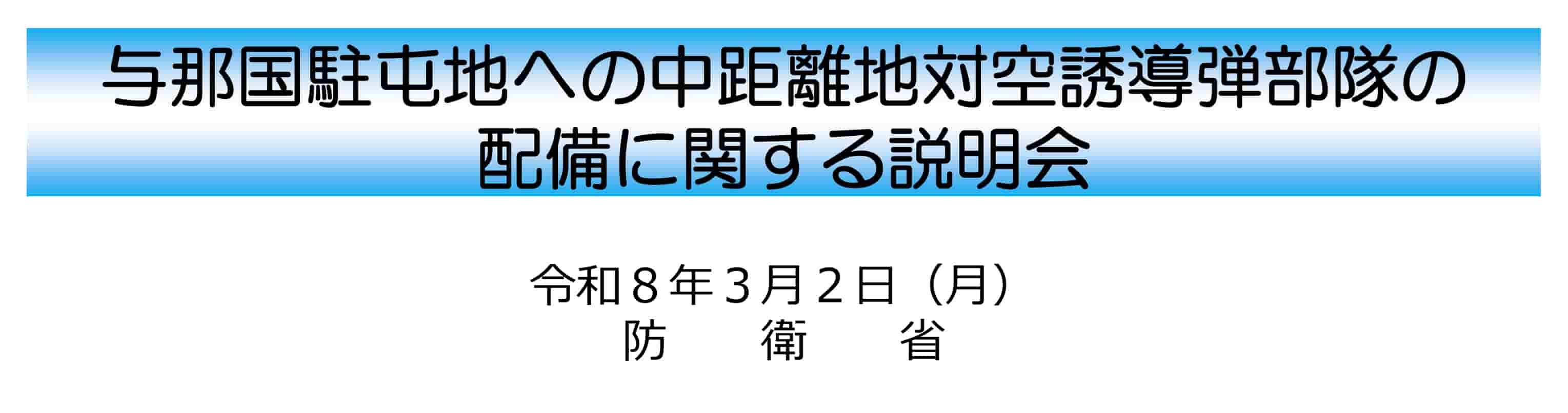 防衛省 沖縄防衛局は令和8(2026)年3月3日(火)、前日に沖縄県の与那国町で実施した中距離地対空誘導弾部隊の配備に関する説明会の資料を公式ウェブサイト上に掲載した。