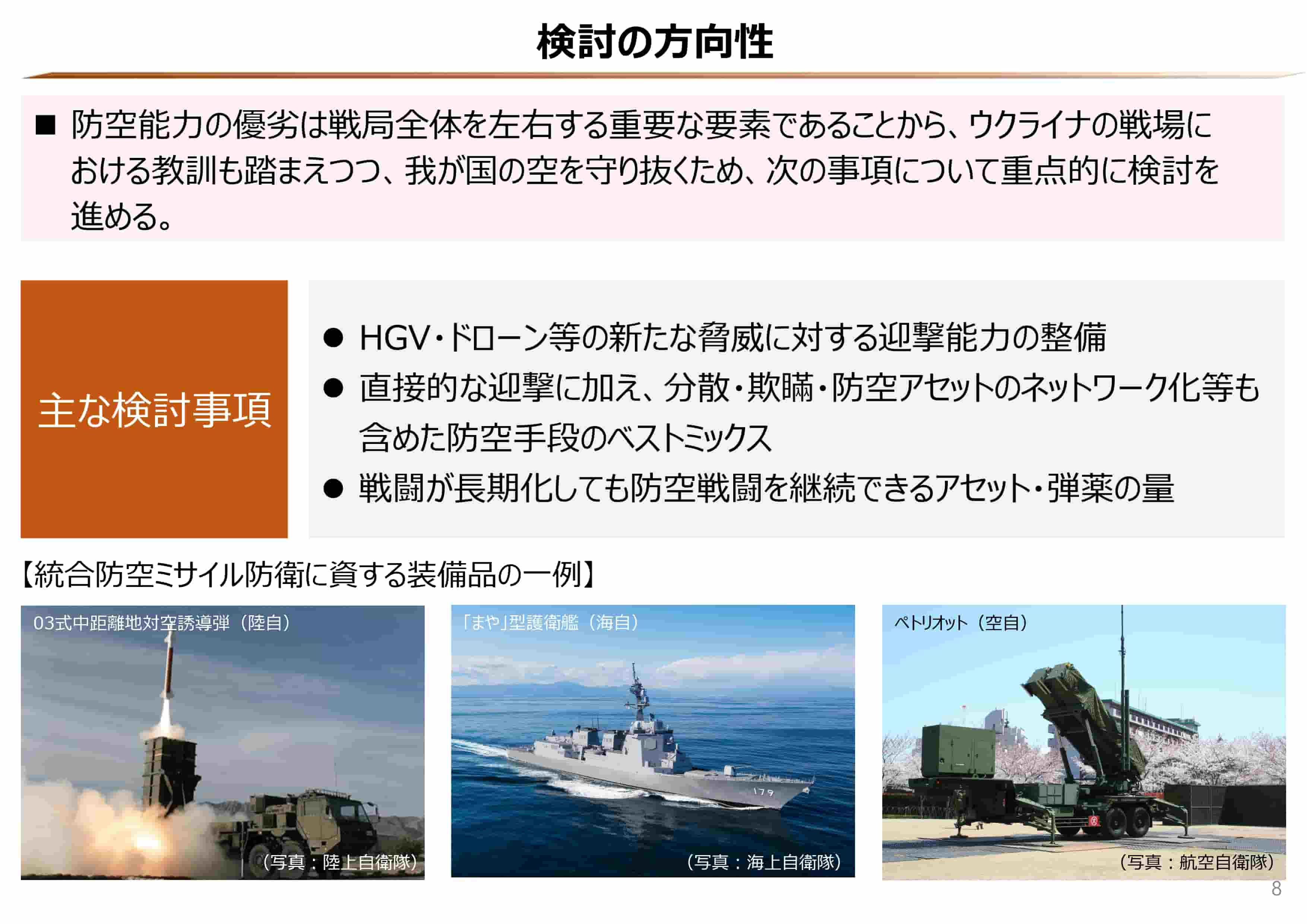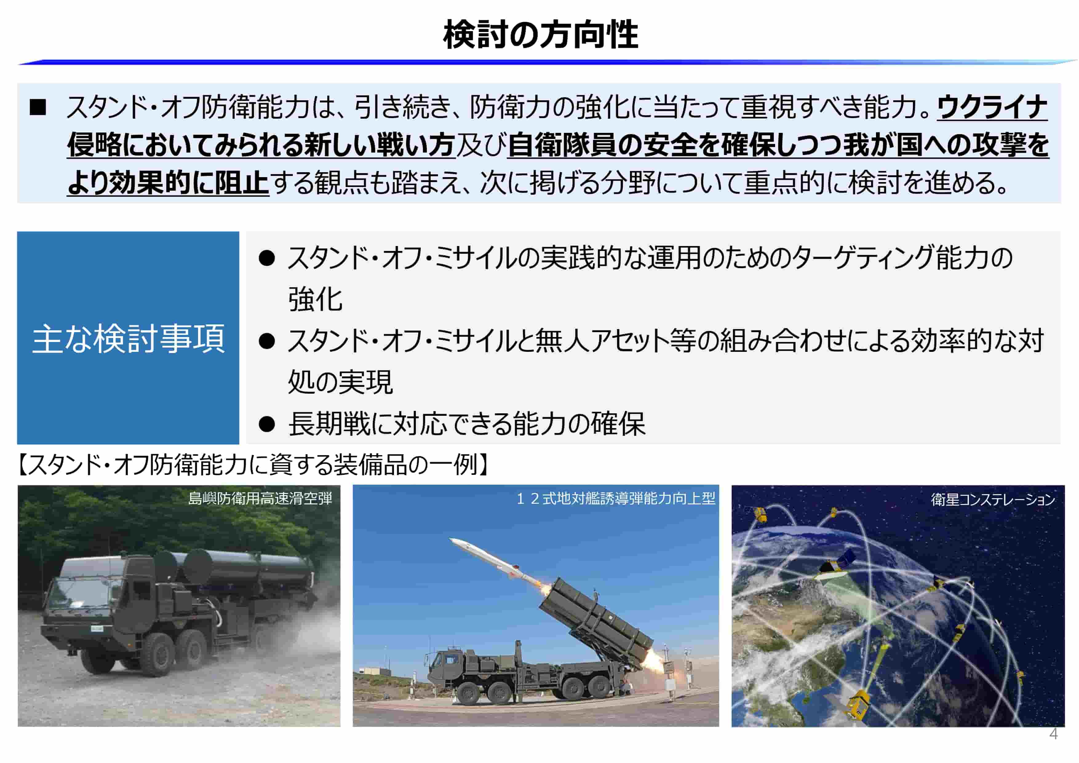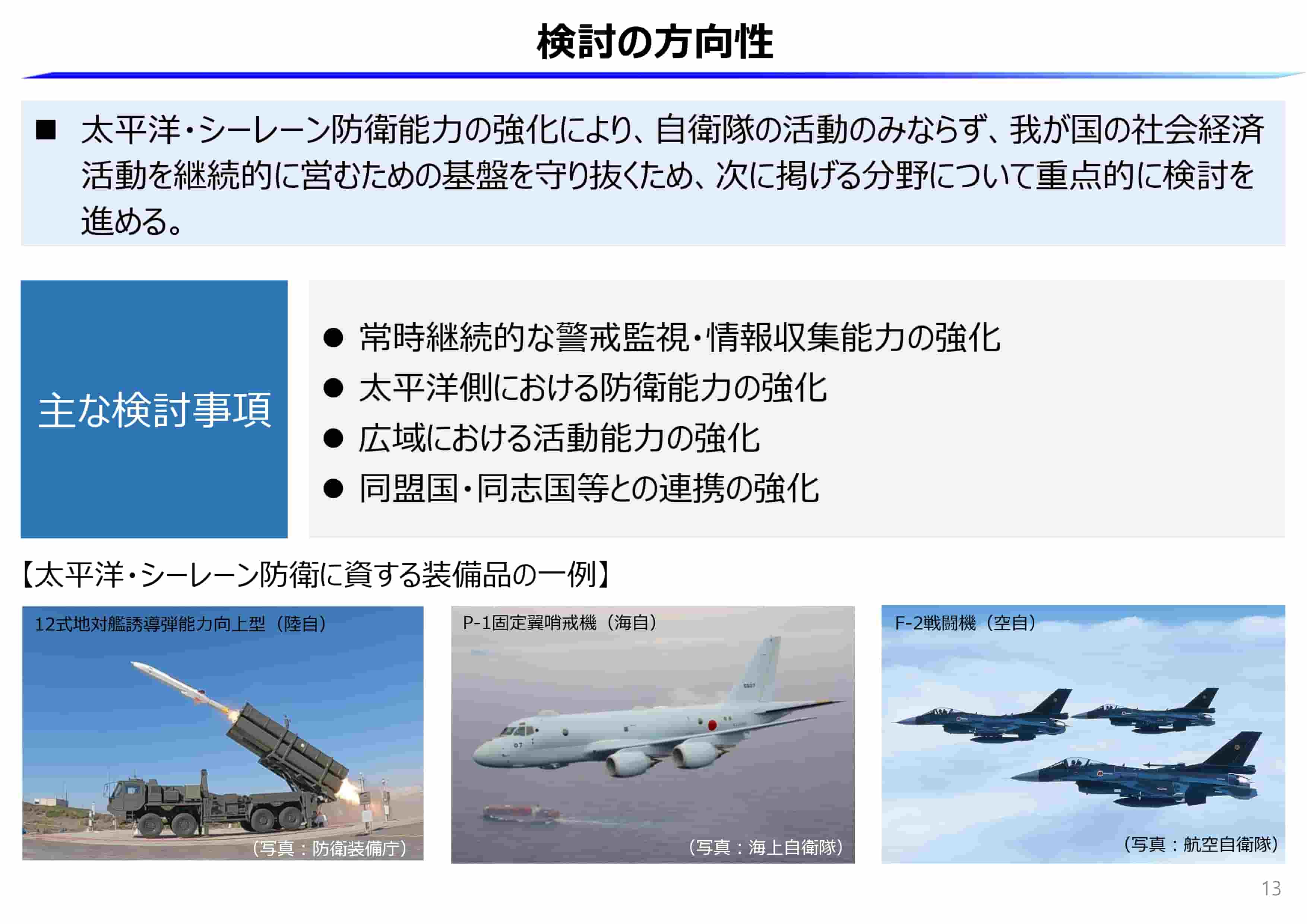 本日は、①スタンド・オフ防衛能力、②統合防空ミサイル防衛能力、③太平洋防衛・シーレーン防衛の3点について方向性を議論します。
