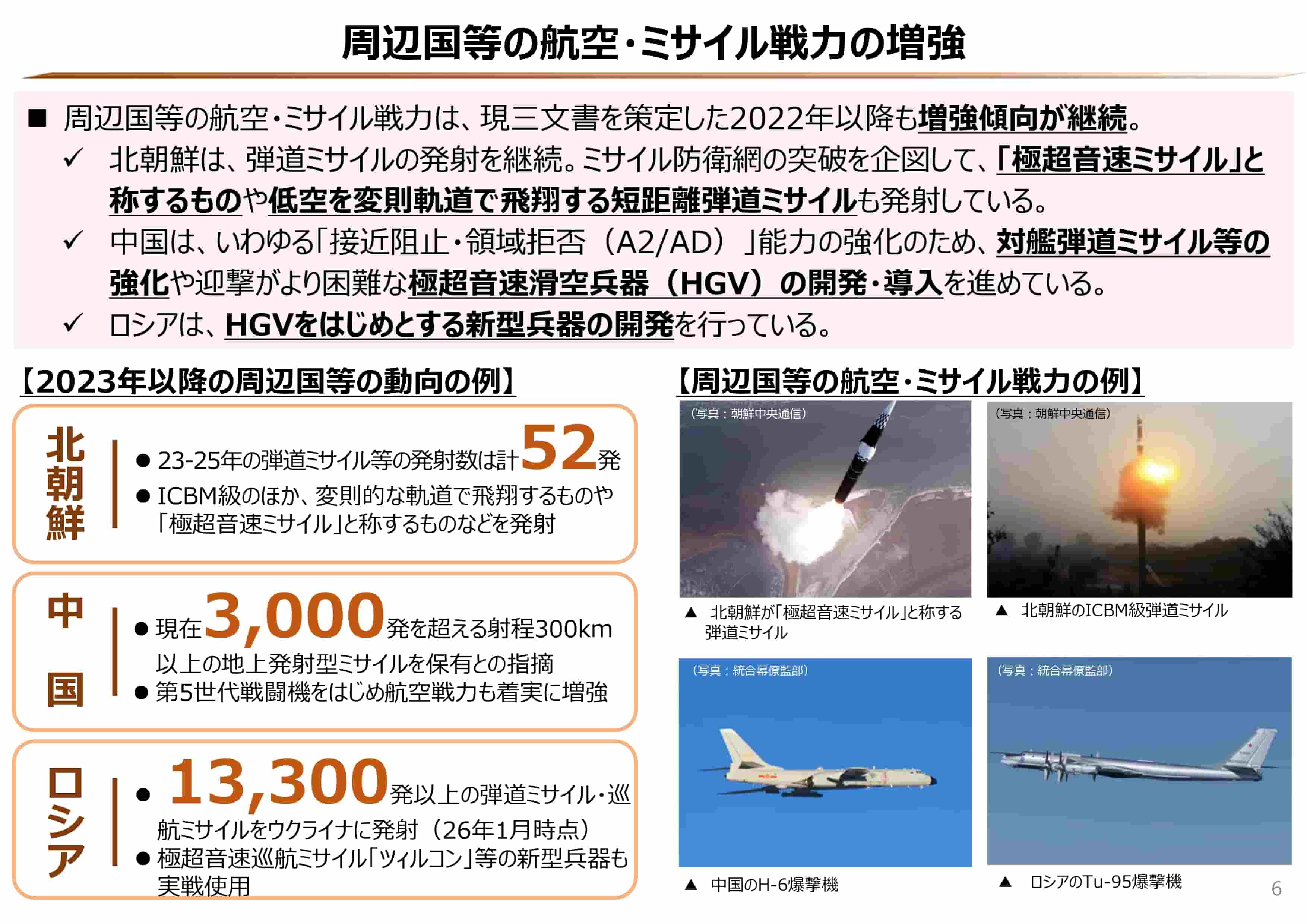 北朝鮮は、極超音速ミサイルと称するものや低空を変則軌道で飛翔する弾道ミサイルを発射しています。中国は、射程3百km以上の地上発射型ミサイルを3千発以上や対艦弾道ミサイルを保有しているほか、ロシア含め、迎撃がより困難な極超音速滑空兵器HGVの導入を進めています。