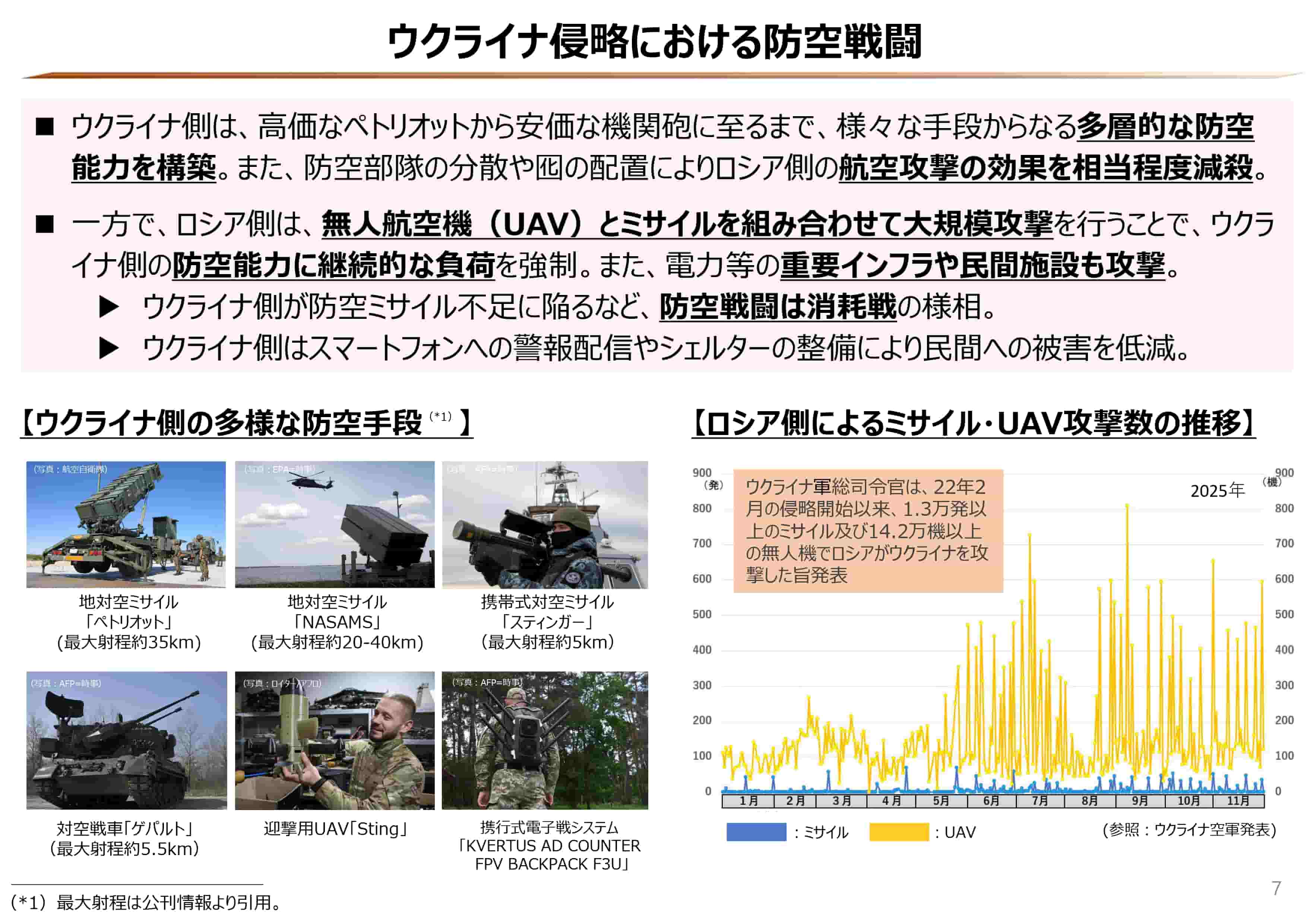 ロシアによる侵略に対して、ウクライナは防空アセットの分散配置等により緒戦で戦力の大半を航空攻撃から守ることができました。これが、ウクライナが粘り強く戦うことのできている理由の1つです。また、現在、イランから周辺国にミサイル等による攻撃が行われていますが、各国は米軍とも協力し、防空システム等により国民への被害の局限を図っています。