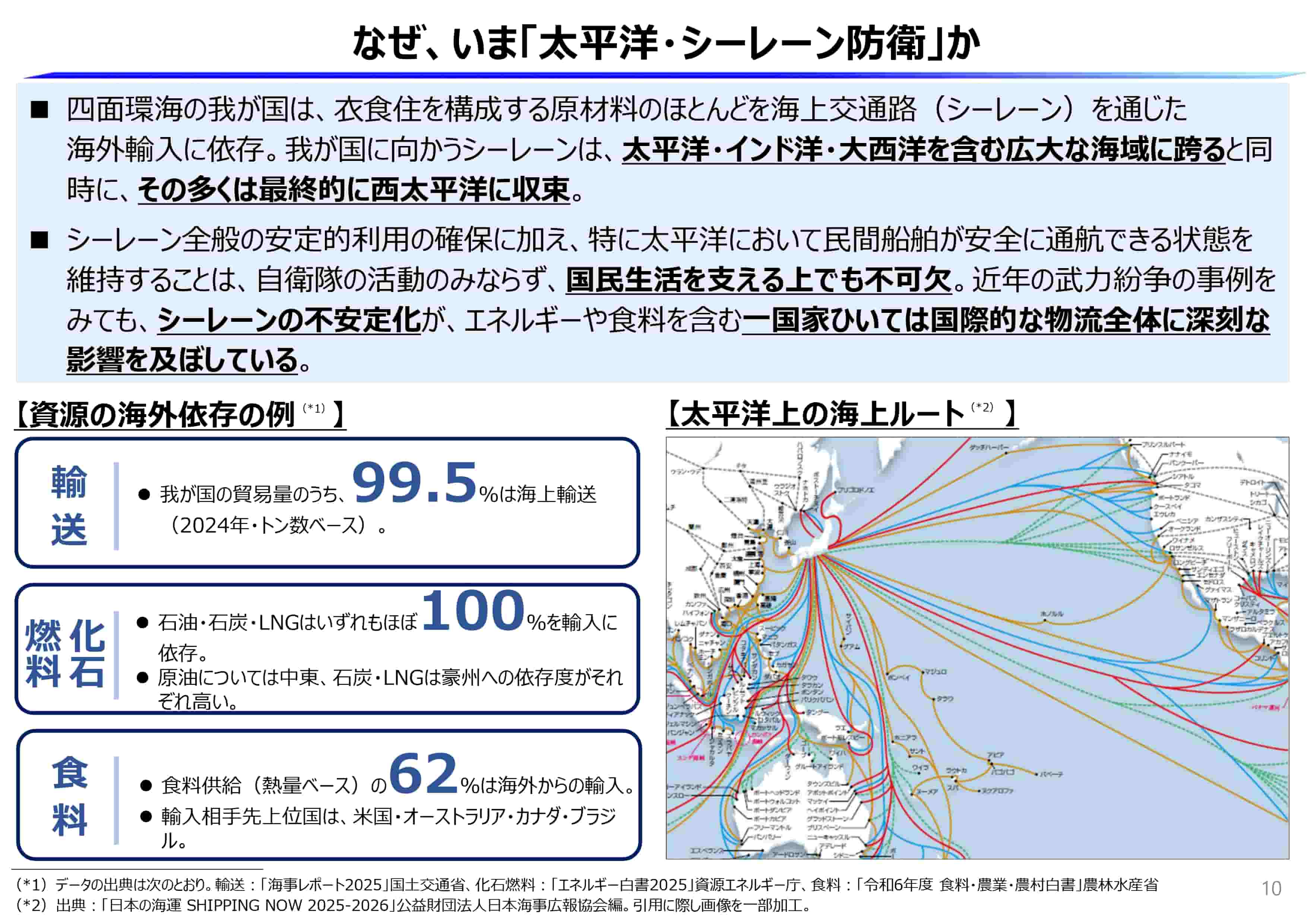 四方を海に囲まれた我が国は、衣食住の原材料のほとんどを海上交通路を通じた輸入に依存しており、シーレーンの安全は我が国の経済活動の生命線です。そして、国家としての経済活動が継続されなければ、自衛隊が長期戦を戦い抜くことも不可能です。