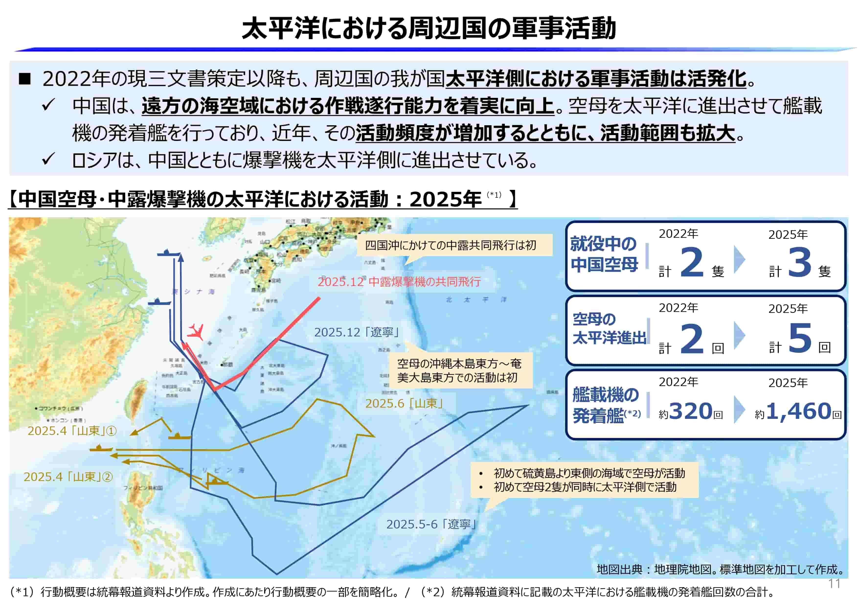 昨年12月には、中国空母が初めて、沖縄本島東方から奄美大島東方の太平洋上にかけて航行しました。また、中国とロシアによる爆撃機の共同飛行も活発に行われています。