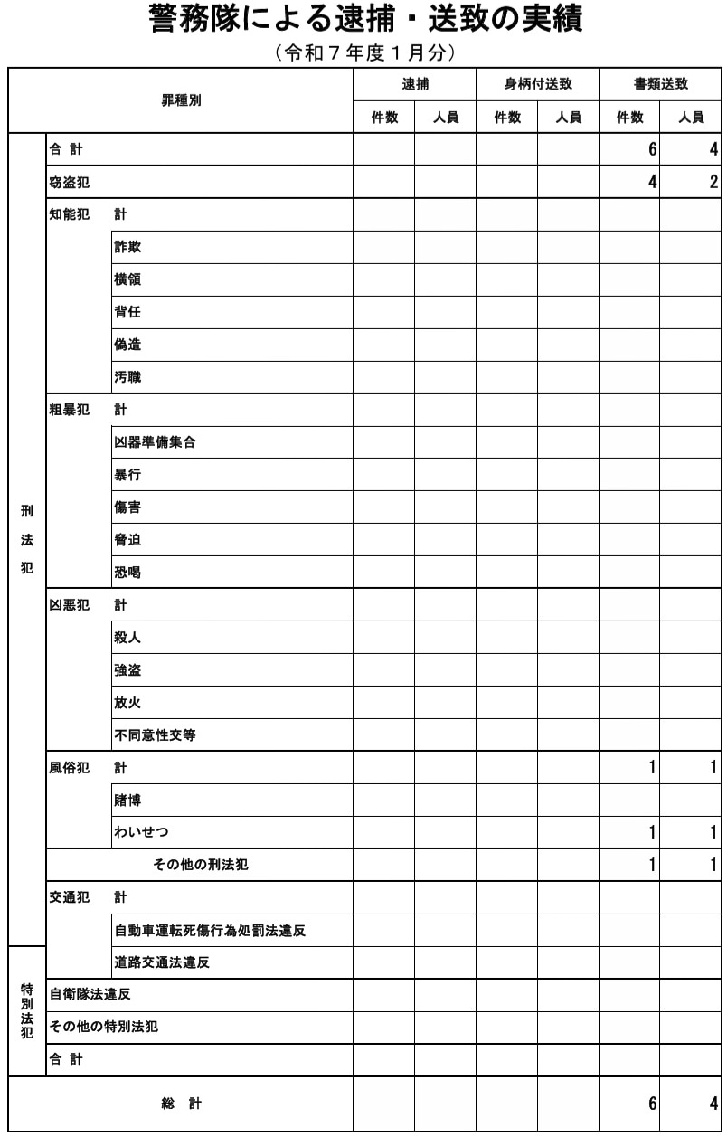 防衛省 海上幕僚監部は令和8(2026)年3月13日(金)13時00分、令和8年1月の警務隊による逮捕・送致の実績について以下のように公表した。