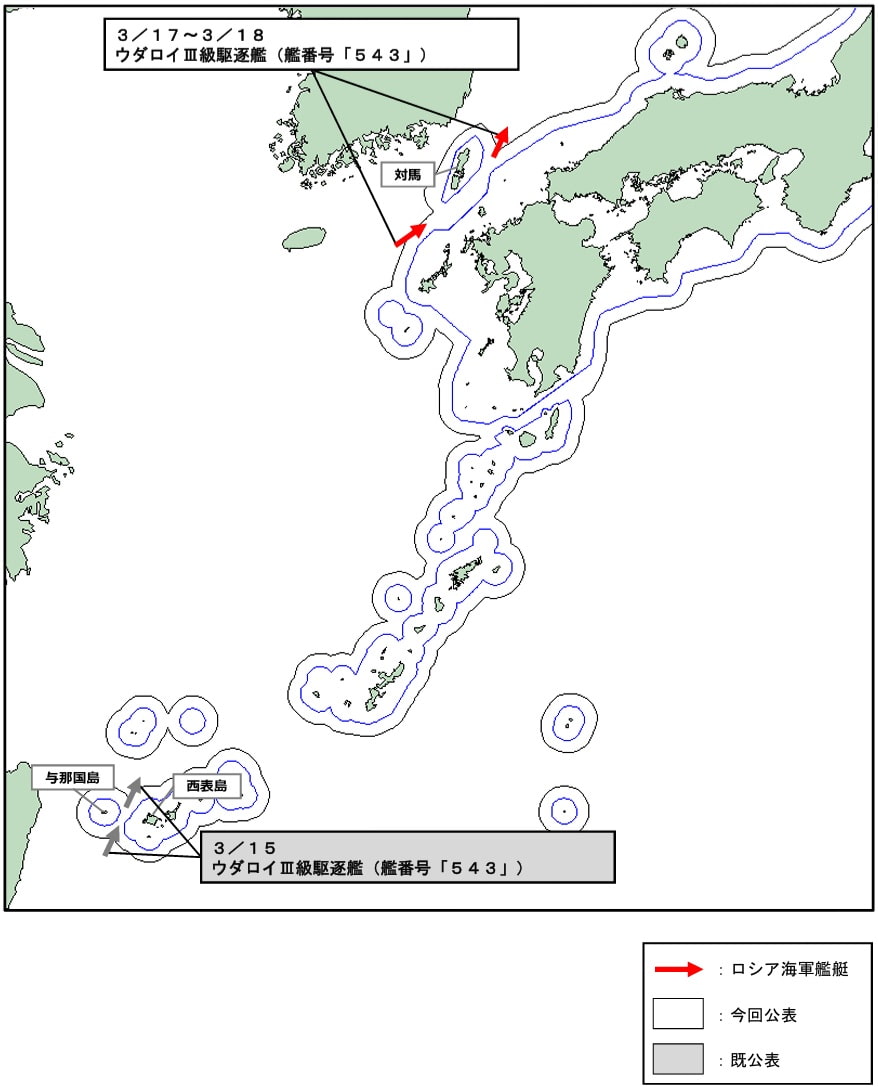 令和8年3月17日(火)午後4時頃、海上自衛隊は、対馬(長崎県)の南西約110kmの海域において、同海域を北東進するロシア海軍ウダロイⅢ級駆逐艦(艦番号「543」)を確認した。