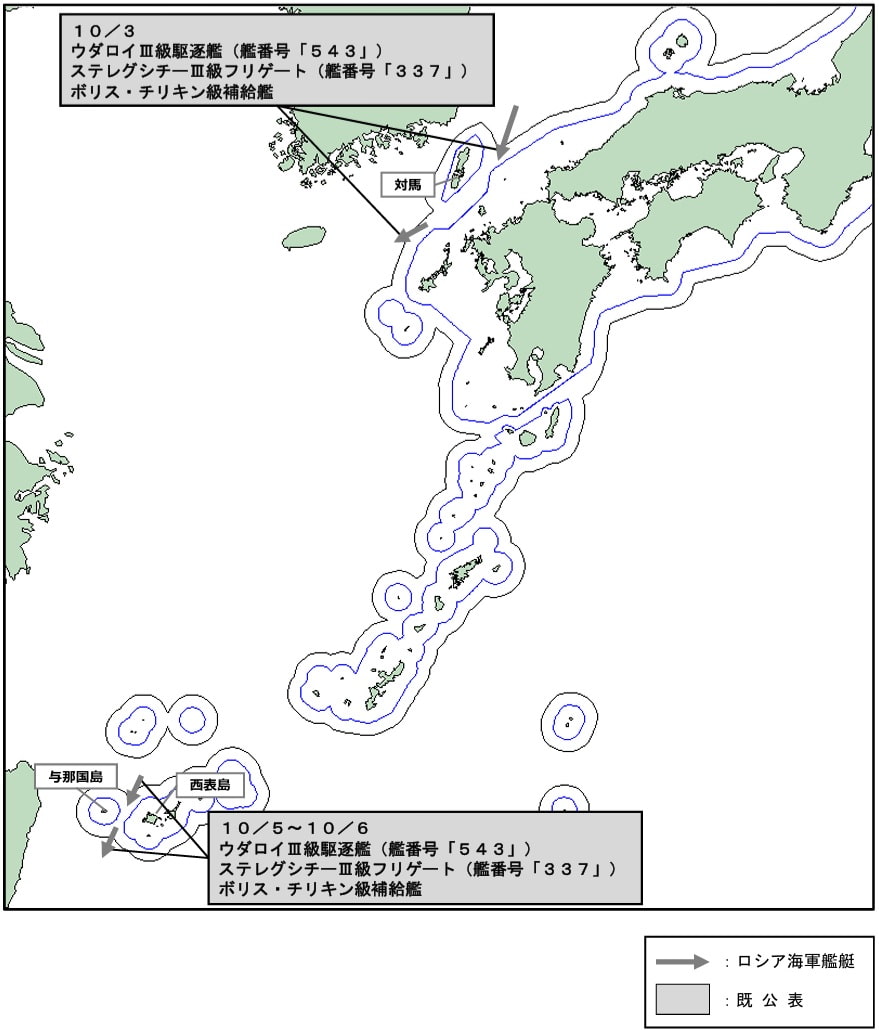 なお、当該艦艇は、令和7年10月3日(金)に対馬海峡を南西進し、10月5日(日)から6日(月)にかけて与那国島と西表島との間の海域を南西進した後、令和8年3月15日(日)に与那国島と西表島との間の海域を北東進したものと同一である。