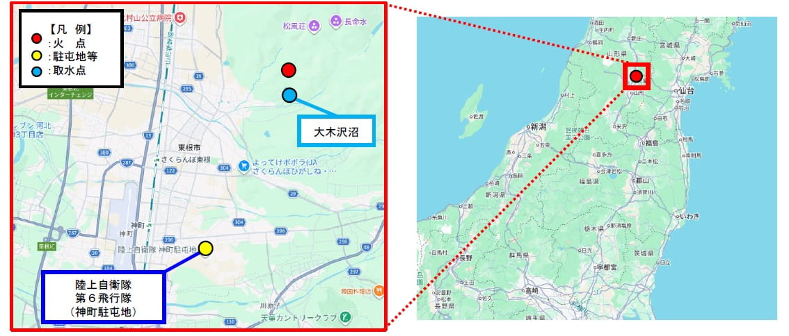 ○ 令和8年3月24日(火)、山形県東根市において林野火災が発生。地元消防等が消火活動を実施するも鎮火に至らないことから、同日16時00分、山形県知事から陸上自衛隊第6師団長(神町・山形県)に対し、空中消火に係る災害派遣要請があり同時刻受理。
