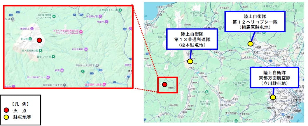 ○ 令和8年3月24日(火)、長野県木曽郡木曽町において林野火災が発生。地元消防等が消火活動を実施するも鎮火に至らないことから、同日19時00分、長野県知事から陸上自衛隊第12旅団長(相馬原・群馬県)に対し、空中消火に係る災害派遣要請があり同時刻受理。