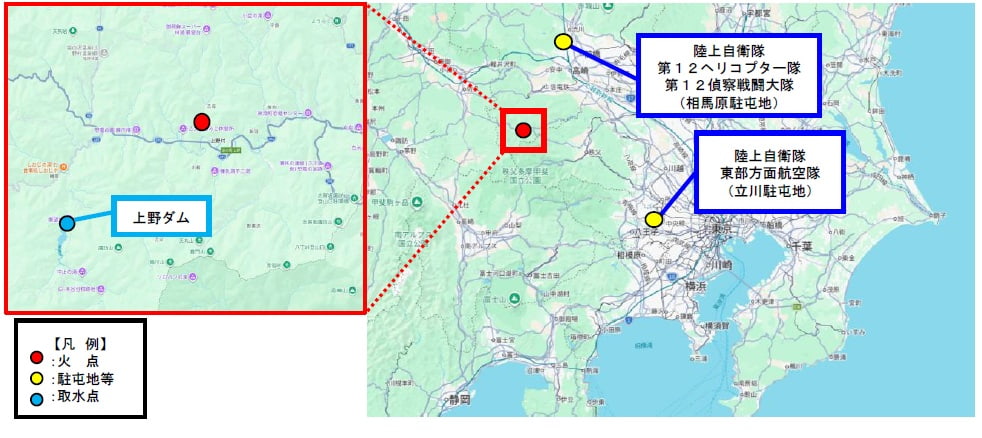 ○ 令和8年3月21日(土)、群馬県多野郡上野村において林野火災が発生。地元消防等が消火活動を実施するも鎮火に至らないことから、同日14時45分、群馬県知事から陸上自衛隊第12旅団長(相馬原・群馬県)に対し、空中消火に係る災害派遣要請があり同時刻受理。