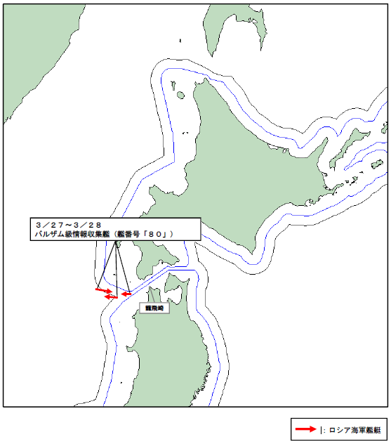 令和8年3月27日(金)午前6時頃、海上自衛隊は、龍飛崎(青森県)の西約120kmの海域において、同海域を東進するロシア海軍バルザム級情報収集艦(艦番号「80」)を確認した。