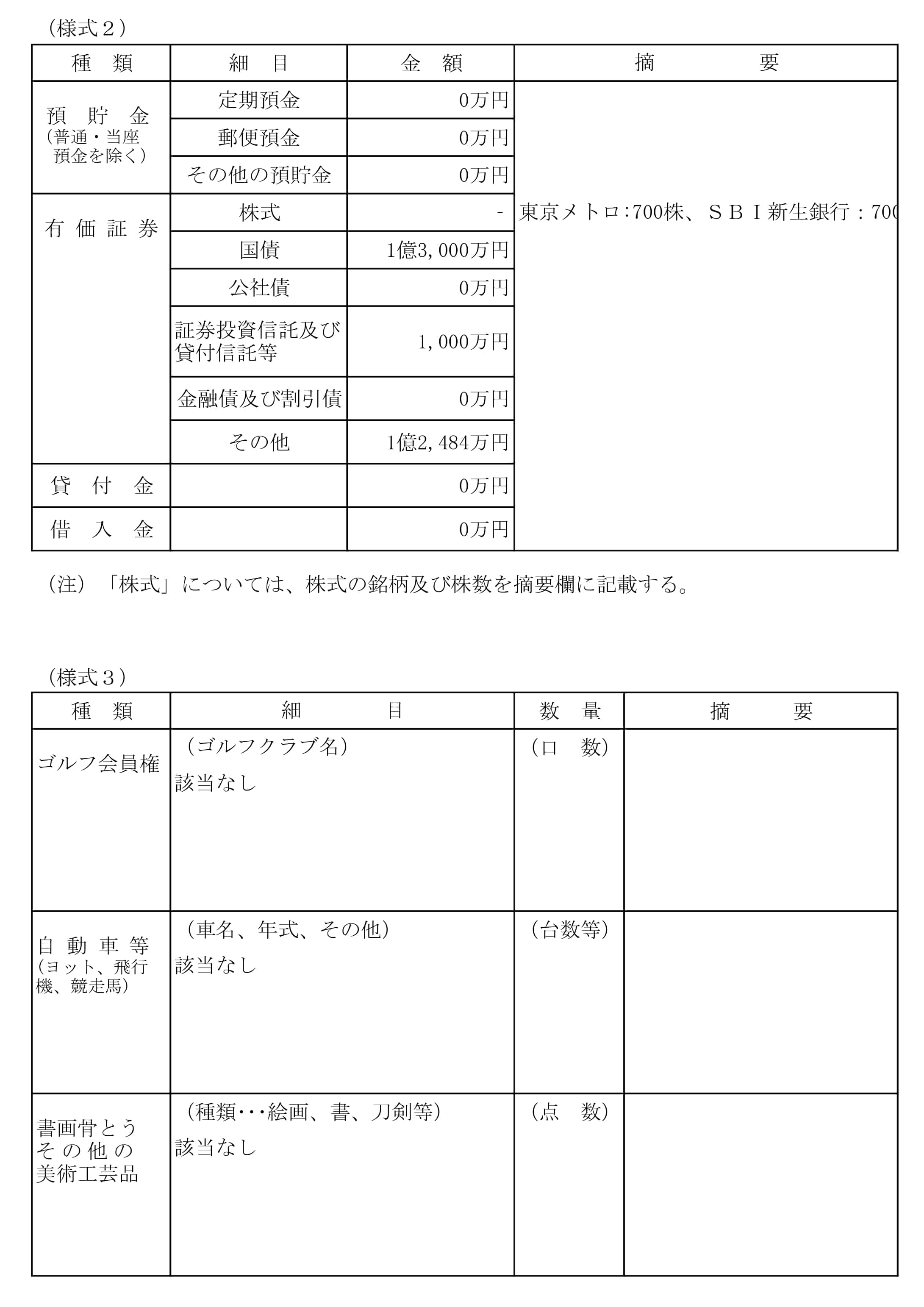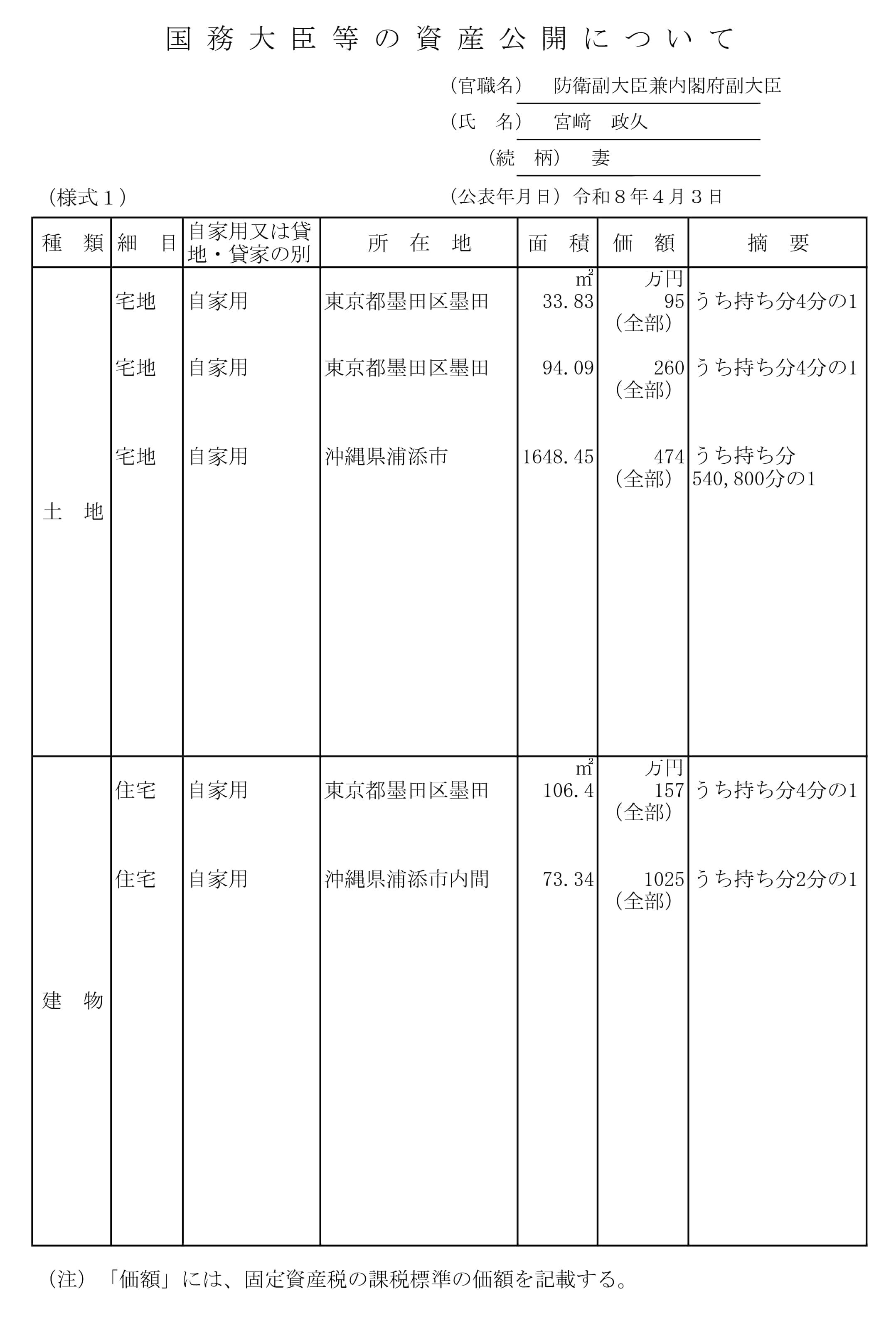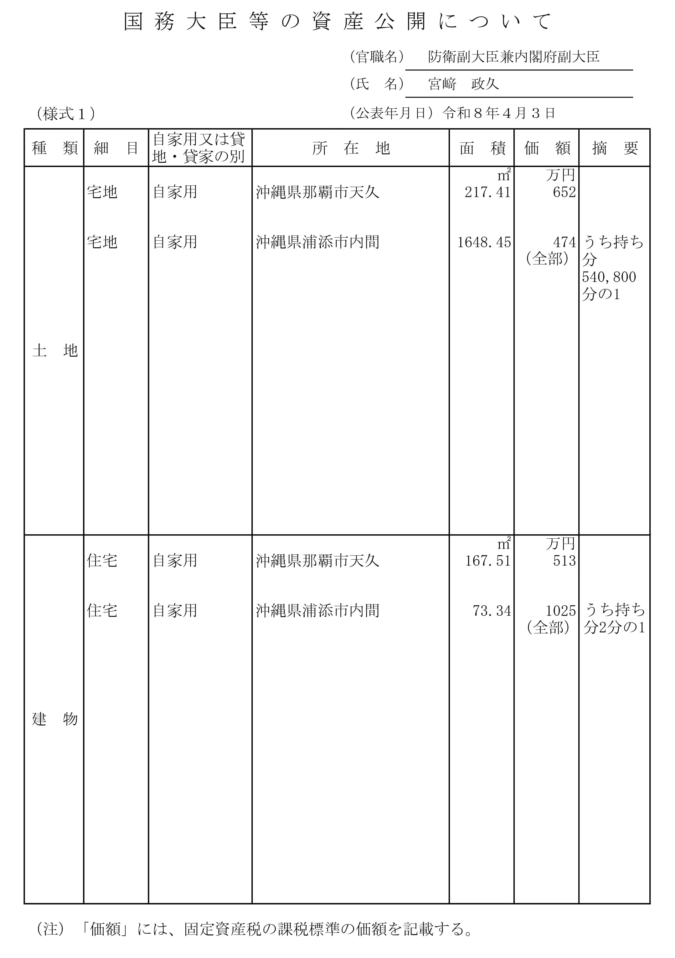 本資料は、公職にある者としての清廉さを保持し、政治と行政への国民の信頼を確保する等の観点から定められた大臣等規範に基づいて、就任時と退任時の資産が公開されるもの。今回は4名とも第1次高市内閣からの続投である。