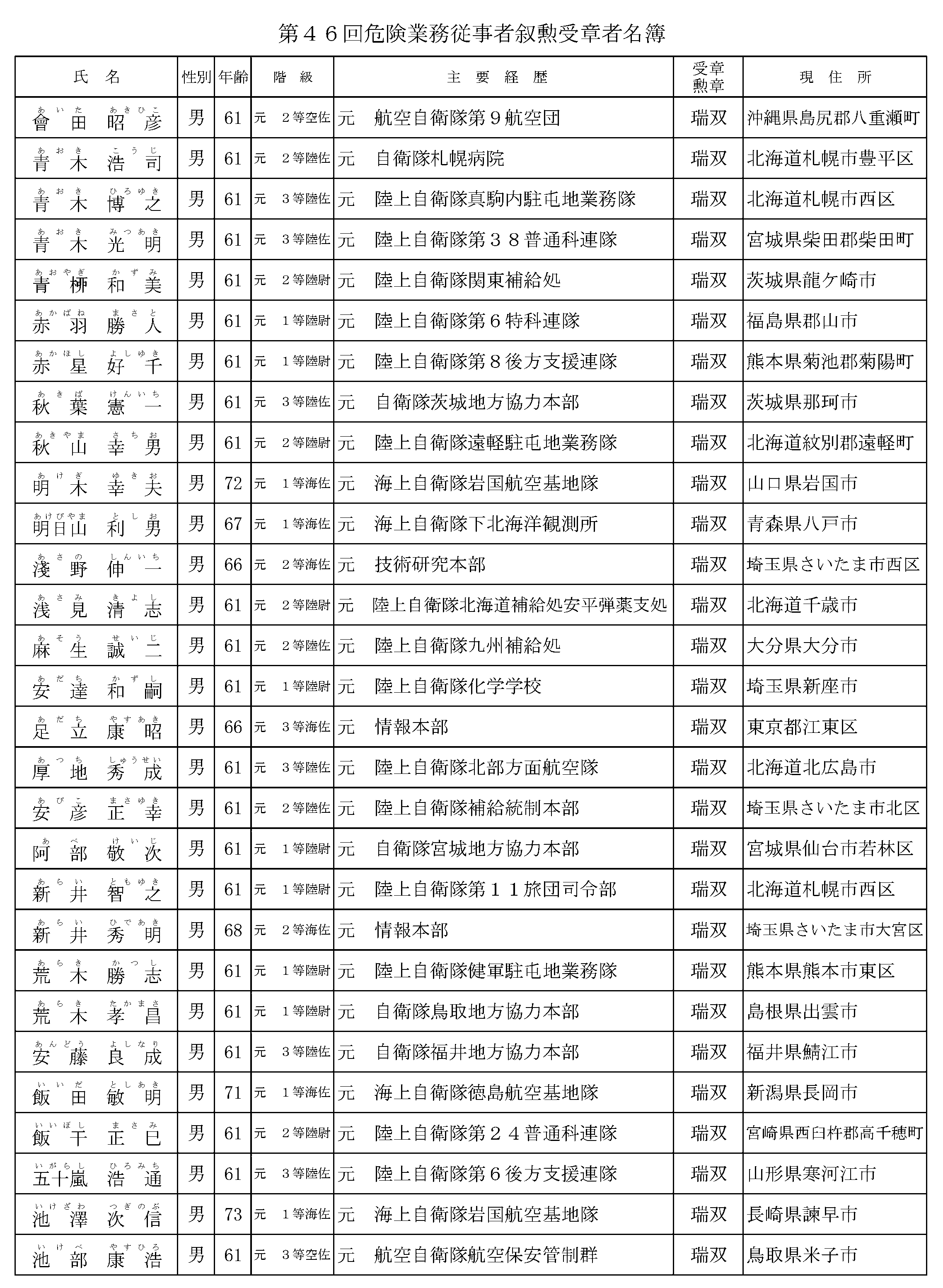 第46回危険業務従事者叙勲名簿(氏名、性別、年齢、階級、主要経歴、受章勲章等)