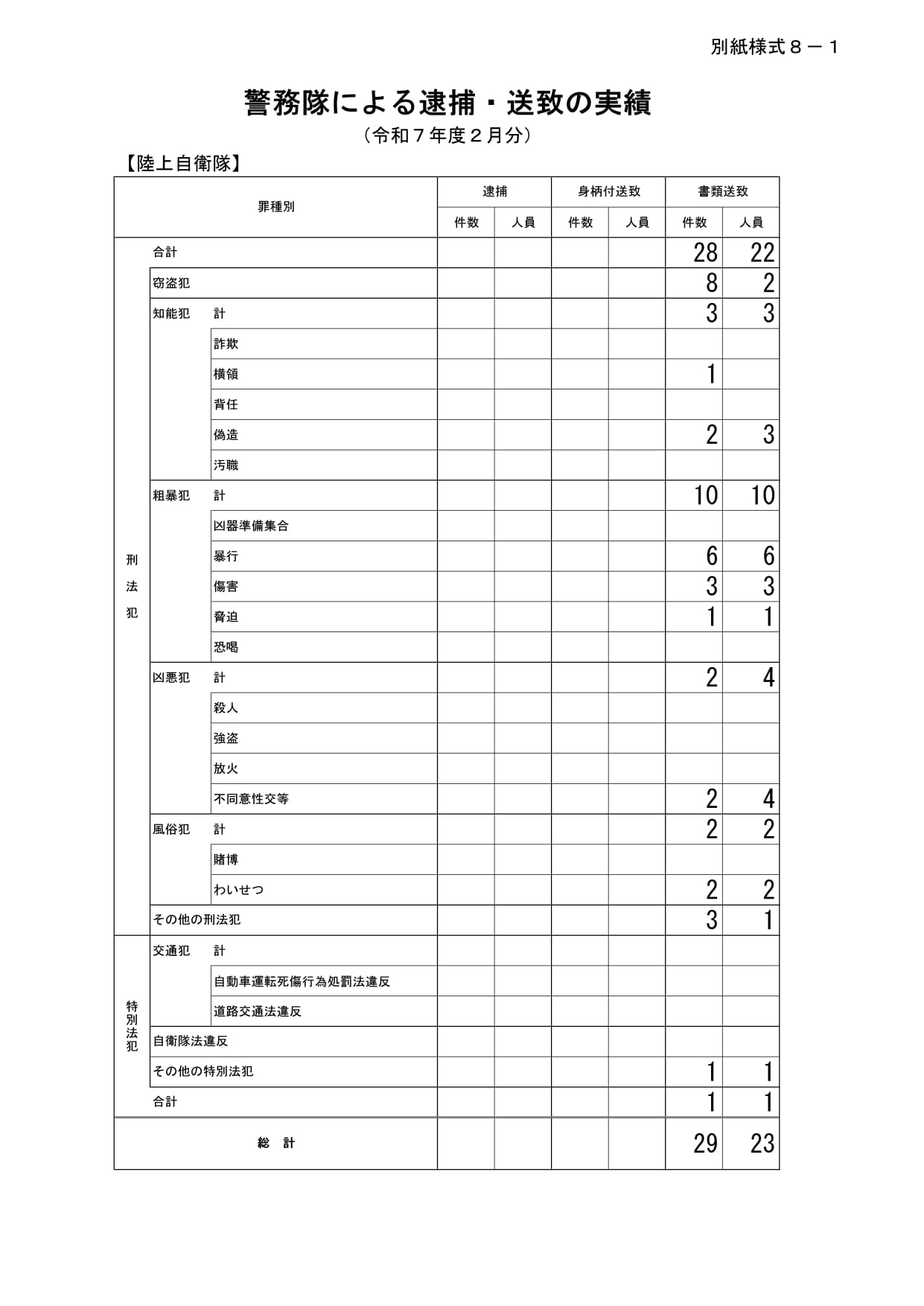 防衛省 陸上幕僚監部は令和8(2026)年4月10日(金)15時00分、令和8年2月の警務隊による逮捕・送致の実績について以下のように公表した。