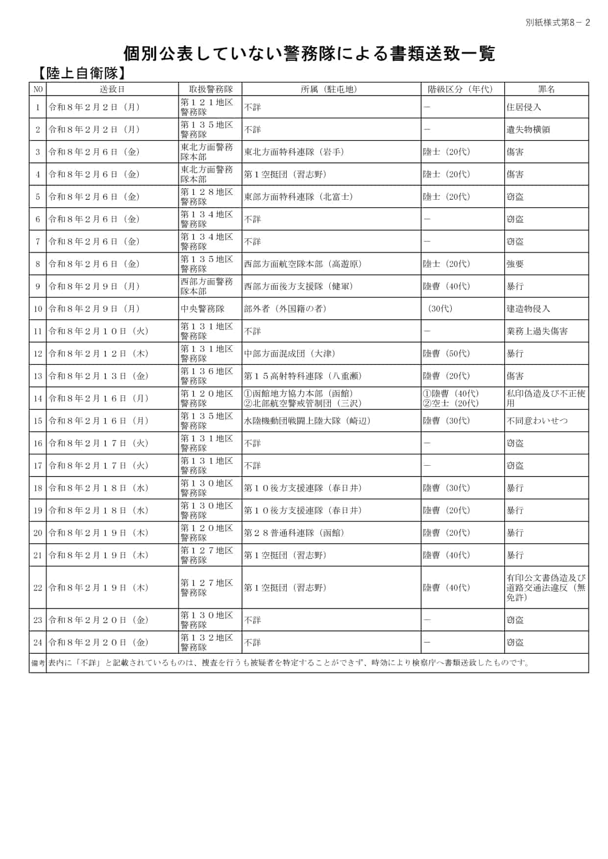 陸上自衛隊、令和8年2月における逮捕・送致の実績を公開(4月10日)
