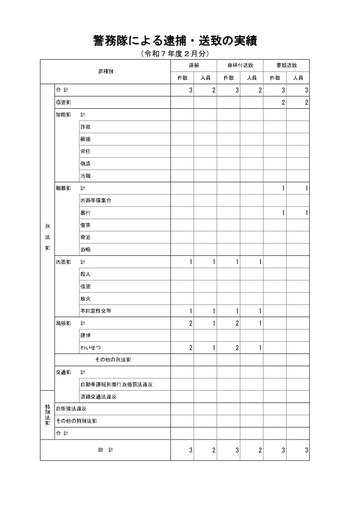(1)警務隊による逮捕・送致の実績(令和8年度2月分)