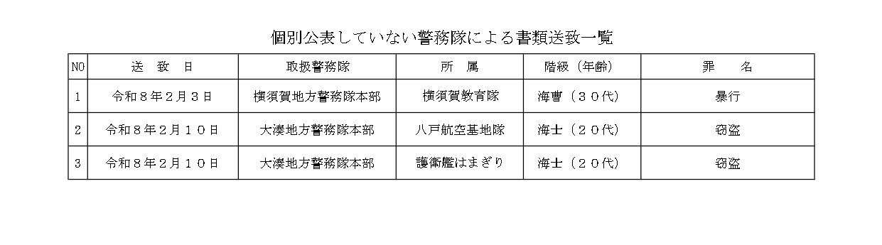 防衛省 海上幕僚監部は令和8(2026)年4月10日(金)15時00分、令和8年2月の警務隊による逮捕・送致の実績について以下のように公表した。