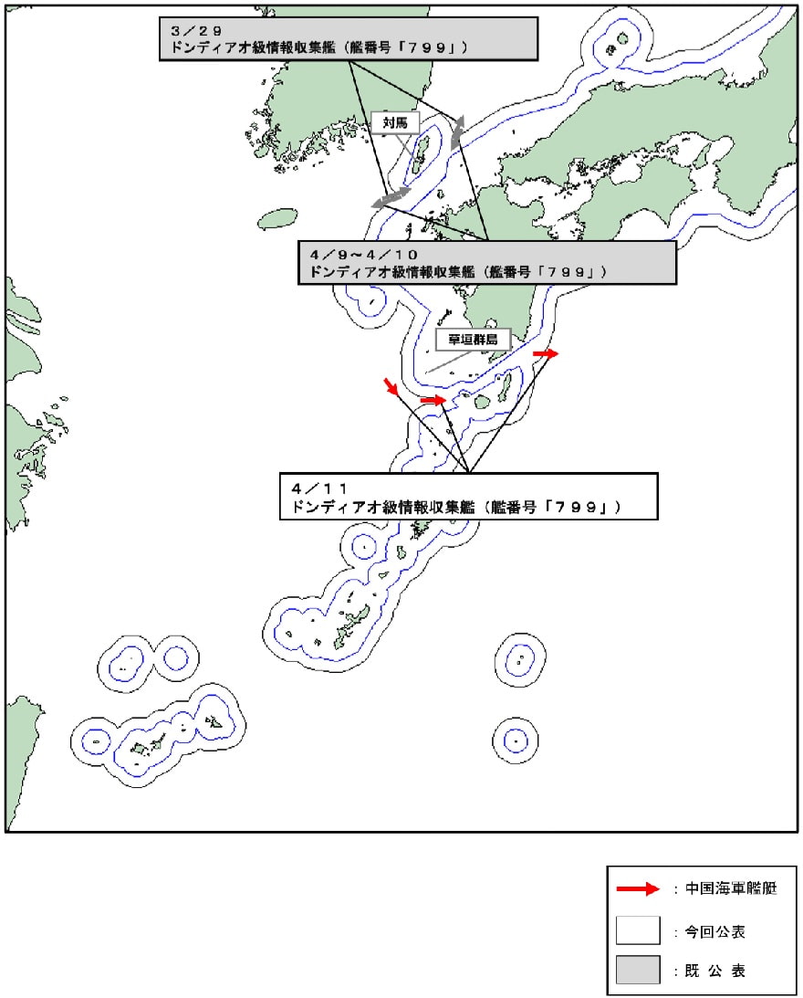 なお、当該艦艇は、3月29日(日)に対馬海峡を北東進し、4月9日(木)から10日(金)にかけて、対馬海峡を南西進したものと同一である。