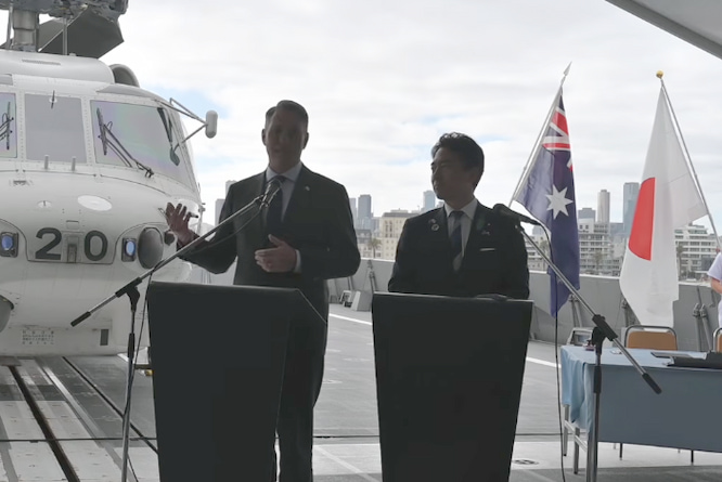 本日は非常に喜ばしい思いでいっぱいです。本日、ここで小泉防衛相をお招きできること、このメルボルンで、そしてステーション・ピアで、さらに、この護衛艦「くまの」上で覚書を締結できたこと、非常に感慨深い思いでいっぱいです。今回の会合は今年に入って3度目となります。この頻度は、このパートナーシップ間日豪関係がどれだけ重要かを表しております。そして、現在の非常に複雑で困難な状況を考えますと、非常に重要な会合ということを示唆しています。何度もこれまでに申し上げておりますが、日本ほど完全に戦略の整合と、そして、信頼関係で結ばれている国は他にございません。本日、護衛艦「もがみ」型能力向上型の契約を締結いたしました。豪州次期汎用フリゲートとして、2029年12月に最初の納入が行われます。そして、この「もがみ」覚書の締結・署名は、両国の防衛産業協力を深化させ、そして、オーストラリア海軍の戦闘能力を強化させる非常に重要な出来事です。そして、この防衛能力産業協力のバリアをなくすということが両国にとって非常に重要であるということを強調したいと考えています。そして日本が、この防衛能力産業協力のバリアを取り除いてくださったことに非常に感謝しています。この次期汎用フリゲートの納入は国防軍の能力を向上するに当たって、非常に重要な出来事となっています。そして、豪州国防軍の23人の水兵が実際に「くまの」護衛艦に乗員して、どれだけこのフリゲートが素晴らしいか、実際に体験することができたことは非常に感慨深いものです。そして「くまの」は、オーストラリア最大の演習「KAKADU」に参加していただくことができました。「KAKADU」はオーストラリア最大であるだけでなく、南半球での最大の演習となります。そして、政府が水上能力見直しで発表いたしました。その際に、非常に明確に発表いたしましたのは、国防軍、海軍が次期汎用フリゲートを大変必要としていることを明らかにいたしました。この2年という短い間に、入札、そして選定、そして2029年には、最初の次期汎用フリゲートがオーストラリアに導入されるということになります。そして2030年には、この「もがみ」型次期汎用フリゲートが国防軍、海軍のバックボーンとなります。そして、本日、機密であるゴーストバットに関する情報を共有するという発表をいたします。この情報共有は、防衛産業協力にとって非常に重要な出来事となります。そしてこの度、サイバー防壁に関します意向書も署名することをいたしました。これも両国の防衛協力にとって非常な重要な出来事となっています。小泉防衛相、この度は本当にお迎えできて心から感謝しています。