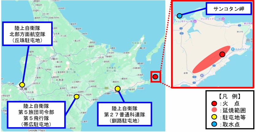 ○ 4月17日(金)07時45分以降、陸上自衛隊第5飛行隊(帯広・北海道)、北部方面航空隊(丘珠・北海道)が空中消火等を実施。